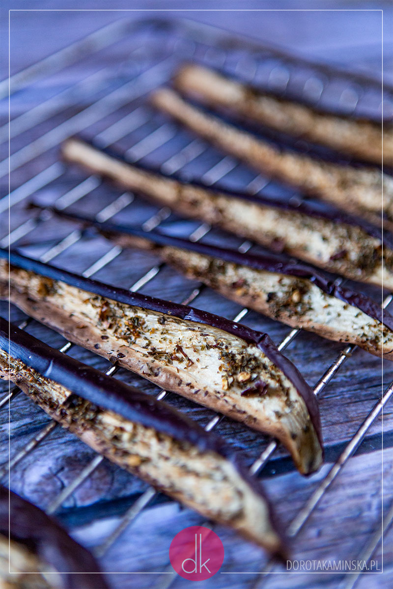 - Bakłażany nacieram oliwą i obtaczam w przyprawach, ziołach i dodatkach. Odstawiam, zawinięte w woreczek lub zamknięte w pudełku, na ok. 30 minut w chłodne miejsce.