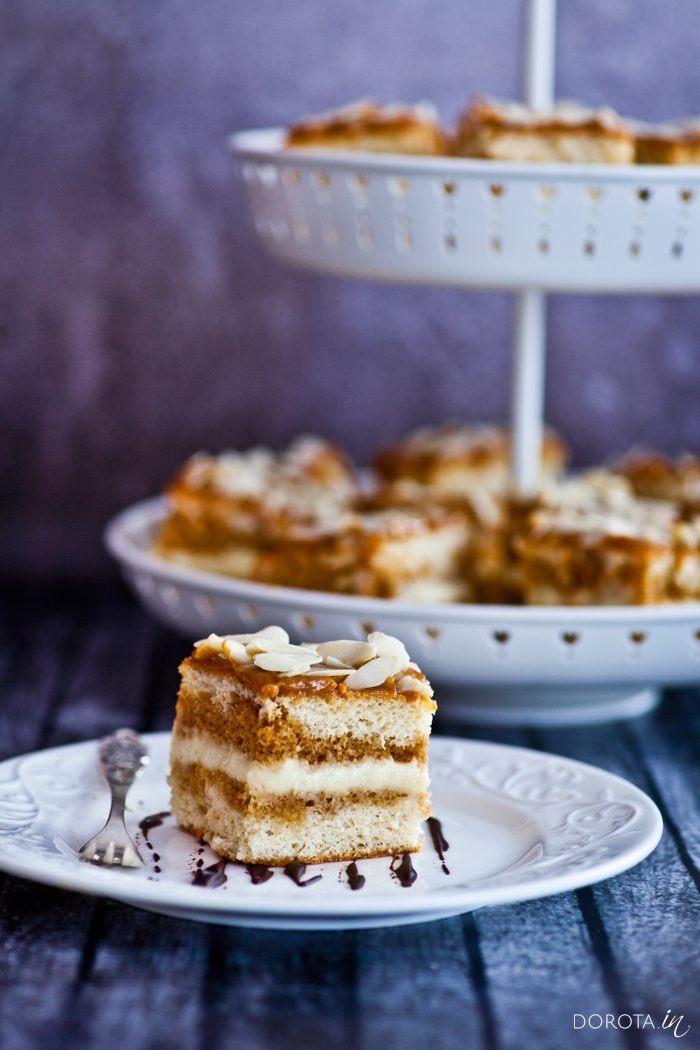 - Na wierzchu ciasta rozsmarowujemy kajmak i posypujemy go płatkami migdałów.
