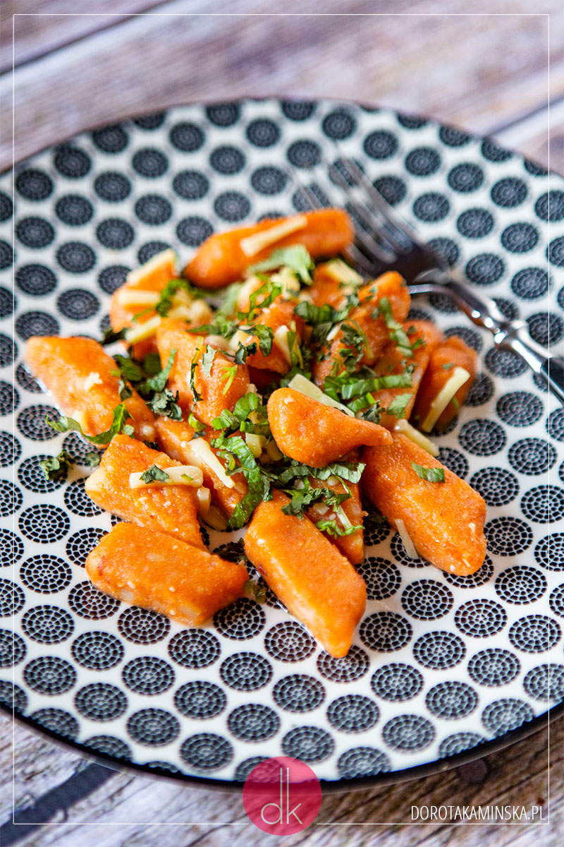 Kopytka z papryką to kolejny obiad przygotowany niedużym kosztem. Jeśli przyrządza się je z pozostałych po obiedzie z poprzedniego dnia ziemniaków i upieczonej na zapas papryki, można przygotować całość w ok. 30 minut. Bardzo lubię kopytka za to, że łatwo się je wykrawa z jednego większego rulonu ciasta. Nie trzeba kulać ręcznie, choć oczywiście można nadać im kształt widelcem. To włoski sposób na to, żeby lepiej przylegał do nich podczas serwowania sos. Zobaczcie jak zrobić kopytka z papryką krok po kroku.