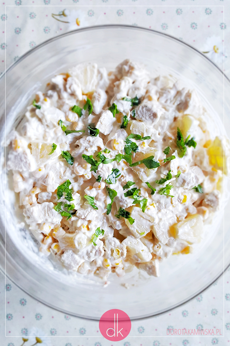 Sałatka z kurczakiem i ananasem od wielu lat gości w mojej rodzinie na stołach podczas spotkań z dowolnej okazji. Nie ma w zasadzie święta czy innej uroczystości, na której by się nie pojawiła. Choć czasem modyfikujemy jej skład, baza jest zawsze ta sama. Musi znaleźć się w niej pierś z kurczaka ugotowana w wywarze warzywnym, kukurydza z puszki, ananas i majonez. Pozostałe składniki to już kwestia wieloletnich modyfikacji. Zobaczcie jak zrobić sałatkę z kurczakiem i ananasem krok po kroku.