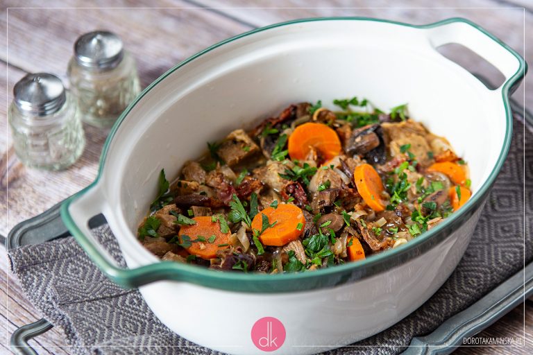 - Przelewam wino do naczynia żaroodpornego. Dodaję boczek, mieszam całość. Uzupełniam wywarem wołowo-warzywnym, żeby całość była zanurzona. Przykrywam.