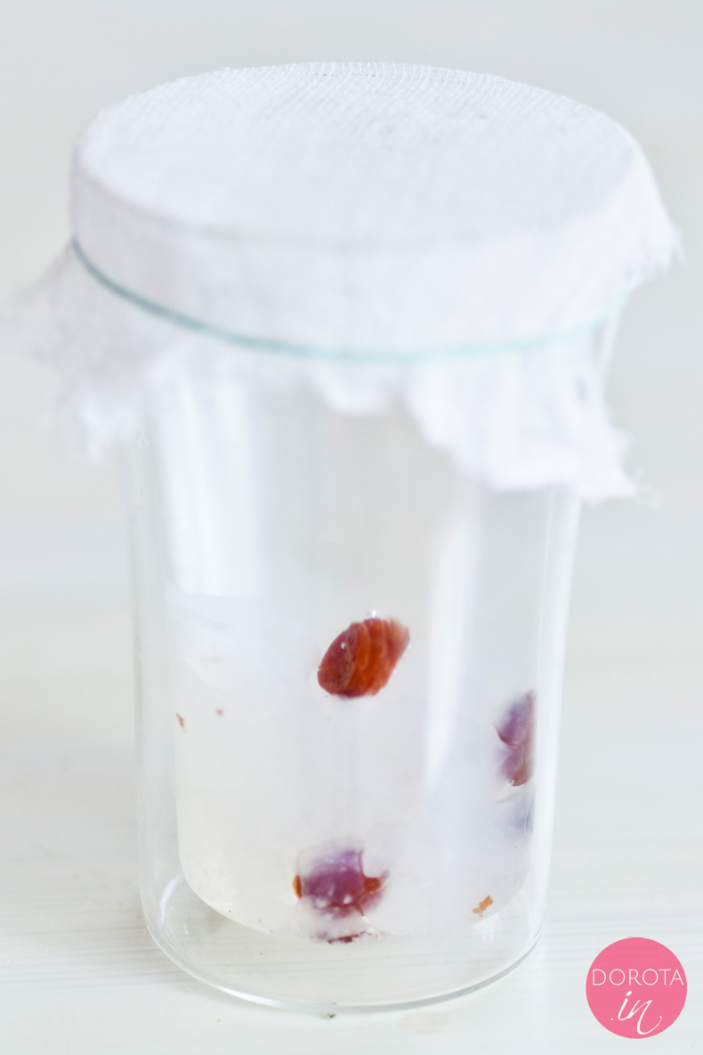 Słoik przykrywam gazą i zabezpieczam gumką. Odstawiam w bezpieczne, nie za gorące i nie za zimne miejsce, z daleka od dużego nasłonecznienia (ale nie musi być całkowicie ciemne) na 24-48 h. Roztwór powinien zabąbelkować, spienić się delikatnie z wierzchu. Czasem trwa to krócej, innym razem dłużej. Kefir wodny powinien mieć sfermentowany zapach i kwaskowaty smak, przypominający bezalkoholowego szampana. Nie ma sensu odcedzać i pić wody, jeśli ma słodkawy posmak i nie zabąbelkowała - to będzie zwykła woda z cukrem, a nie naturalny probiotyk. Trzeba poczekać jeszcze 1-2 dni, a jeśli fermentacja nadal nie nastąpiła, wymienić kryształki na nowe.