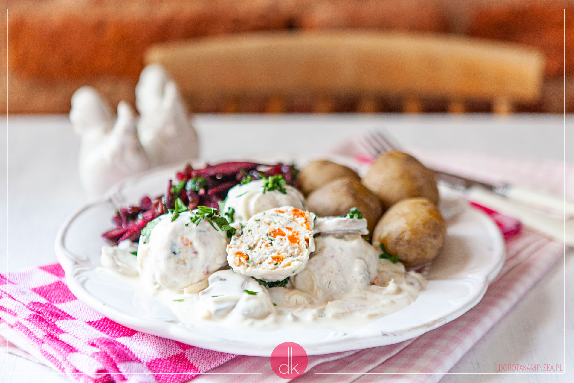 Pulpety z sosem pieczarkowym, a w środku z marchewką, cebulą i ziołami. Doskonałe, delikatne w smaku drobiowe pulpety z sosem śmietankowym z dodatkiem pieczarek.
