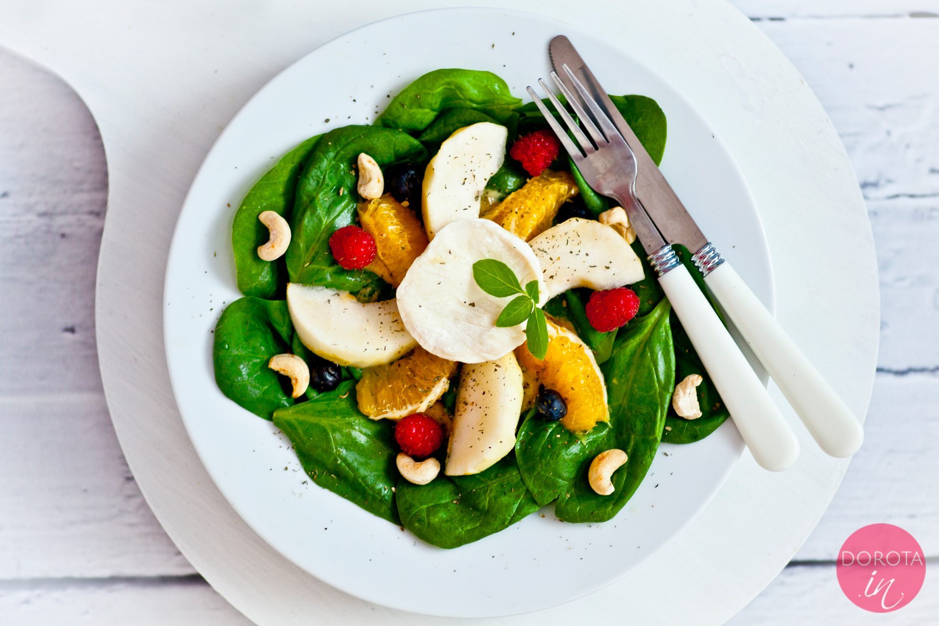 Sałatka ze szpinakiem i serem kozim, z dodatkiem gruszki i pomarańczy oraz malin, borówek amerykańskich i orzechów nerkowców. Najlepsza sałatka ze szpinakiem i kozim serem