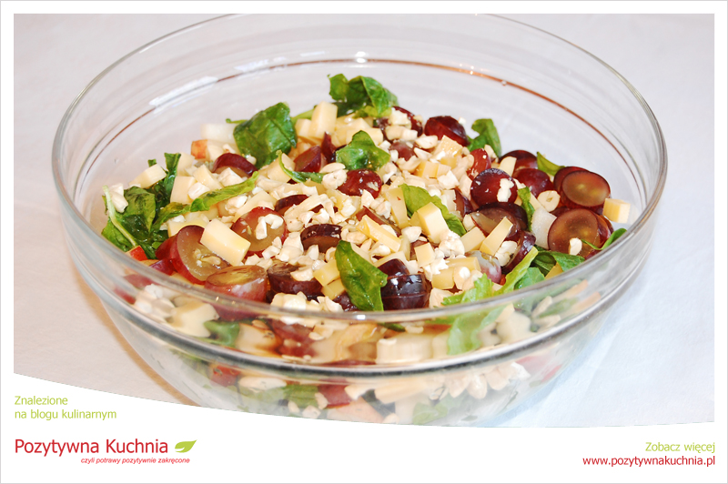 Smaczna i łatwa oraz szybka sałatka ze szpinaku z gruszką, serem i winogronami, które można też zastąpić nasionami granatu, truskawkami, malinami, jagodami lub borówką amerykańską. Delikatnie chrupiące orzechy i oliwa oraz, opcjonalnie, odrobina sosu winegret lub balsamico czyli fantastycznie uzupełniające się smaki.