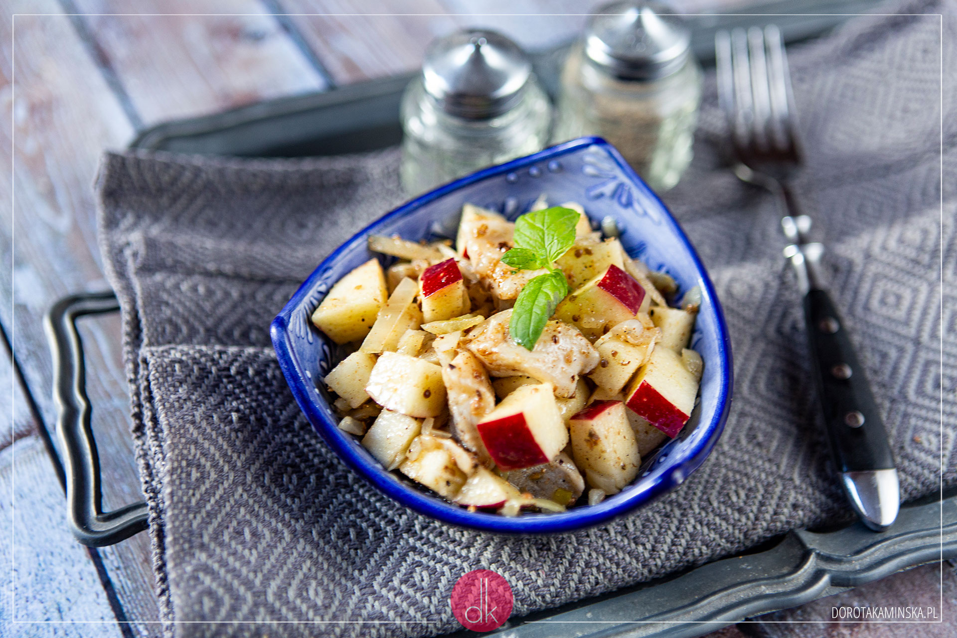Wszystkie składniki mieszam w miseczce i odstawiam do lodówki na ok. 30 minut.Można też wymieszać jabłka z pozostałymi dodatkami smakowymi, a na koniec ułożyć na półmisku na czystych śledziach.