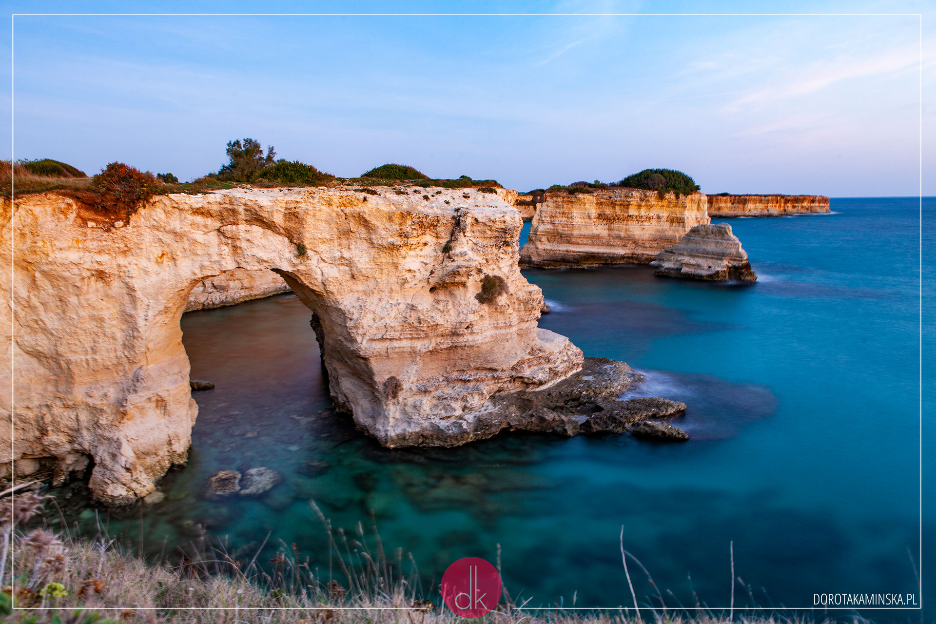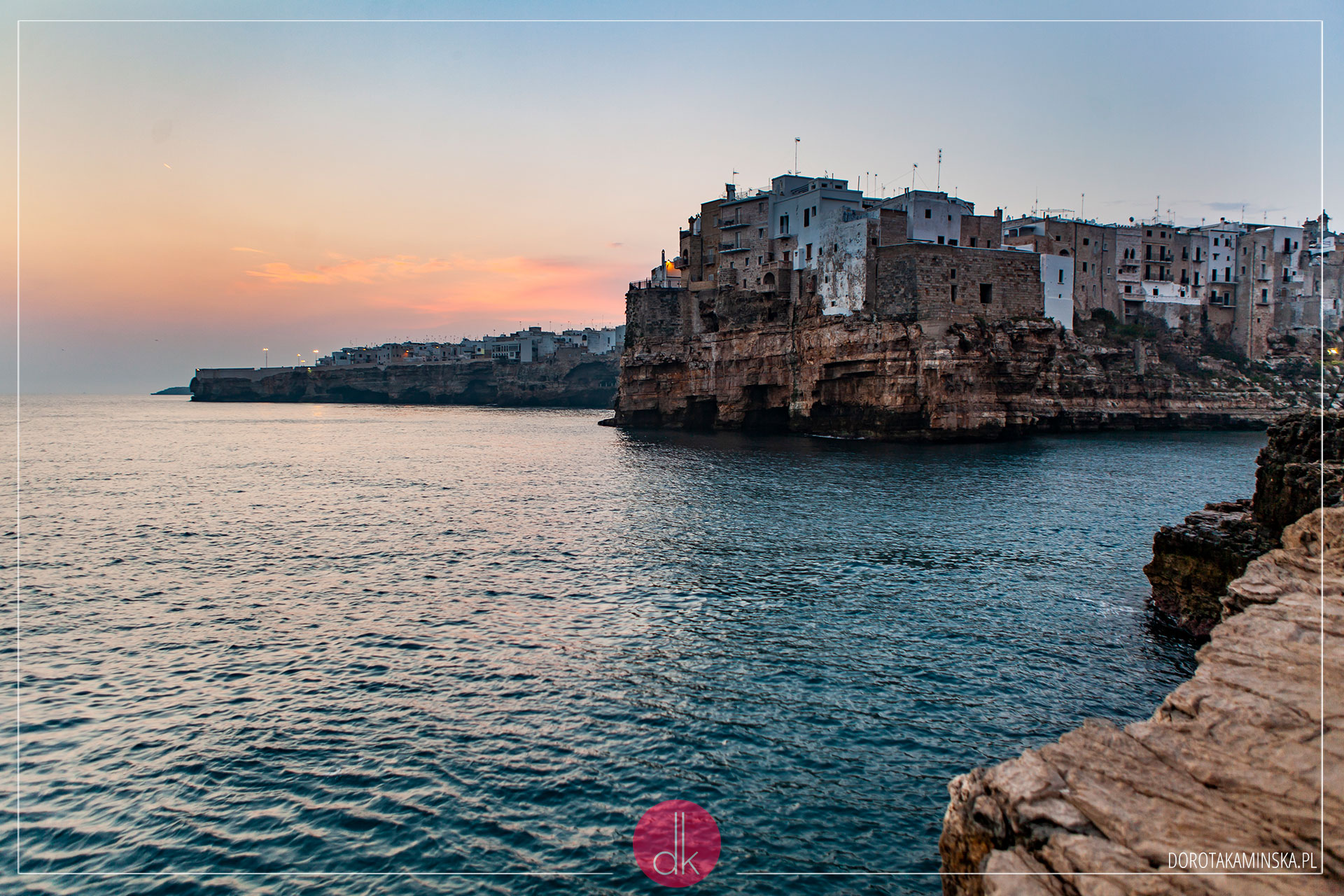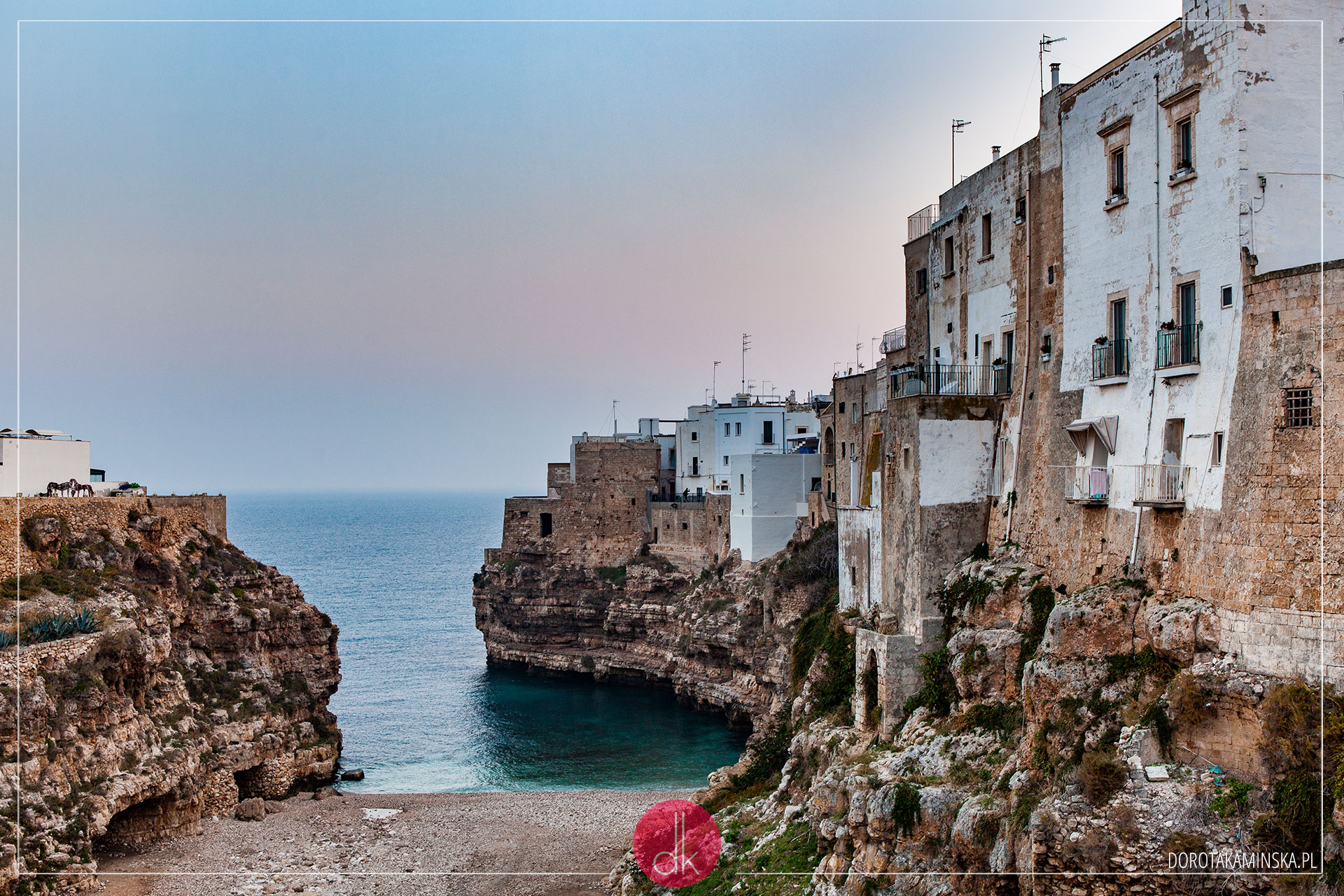 Do kolejnej miejscowości, Polignano a Mare, wyjechaliśmy dużo przed wschodem słońca. Chcieliśmy zdążyć sfotografować tę słynną, piękną miejską plażę, zanim pojawią się na niej turyści. Jednak słońce wschodzi tu po trochę innej stronie i plaża jest dobrze widoczna dopiero gdy się całkowicie przejaśni. Za to widok na budynki na skałach – niezapomniany!