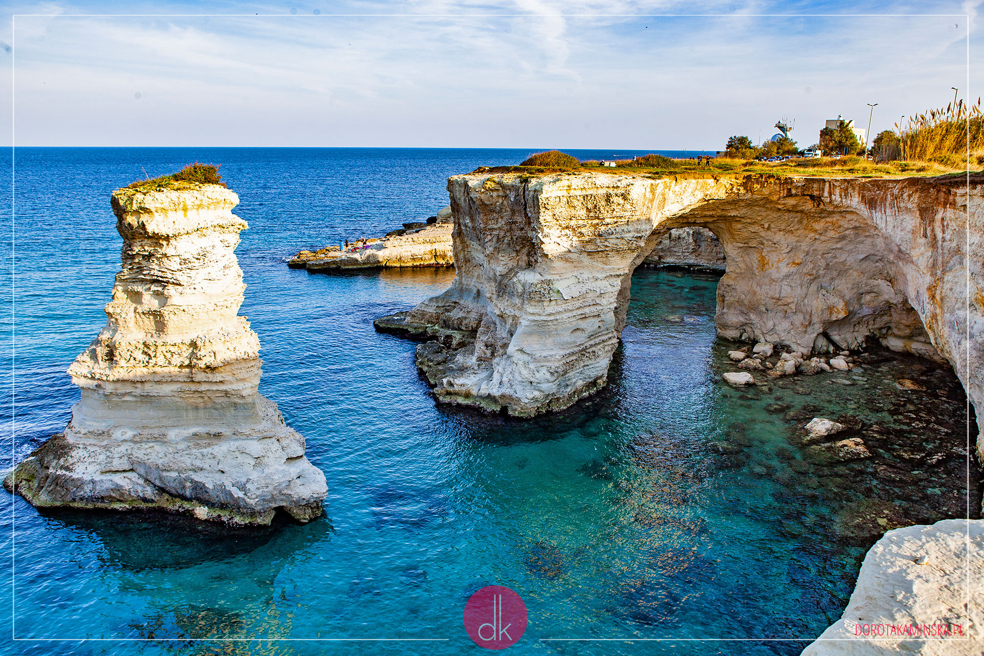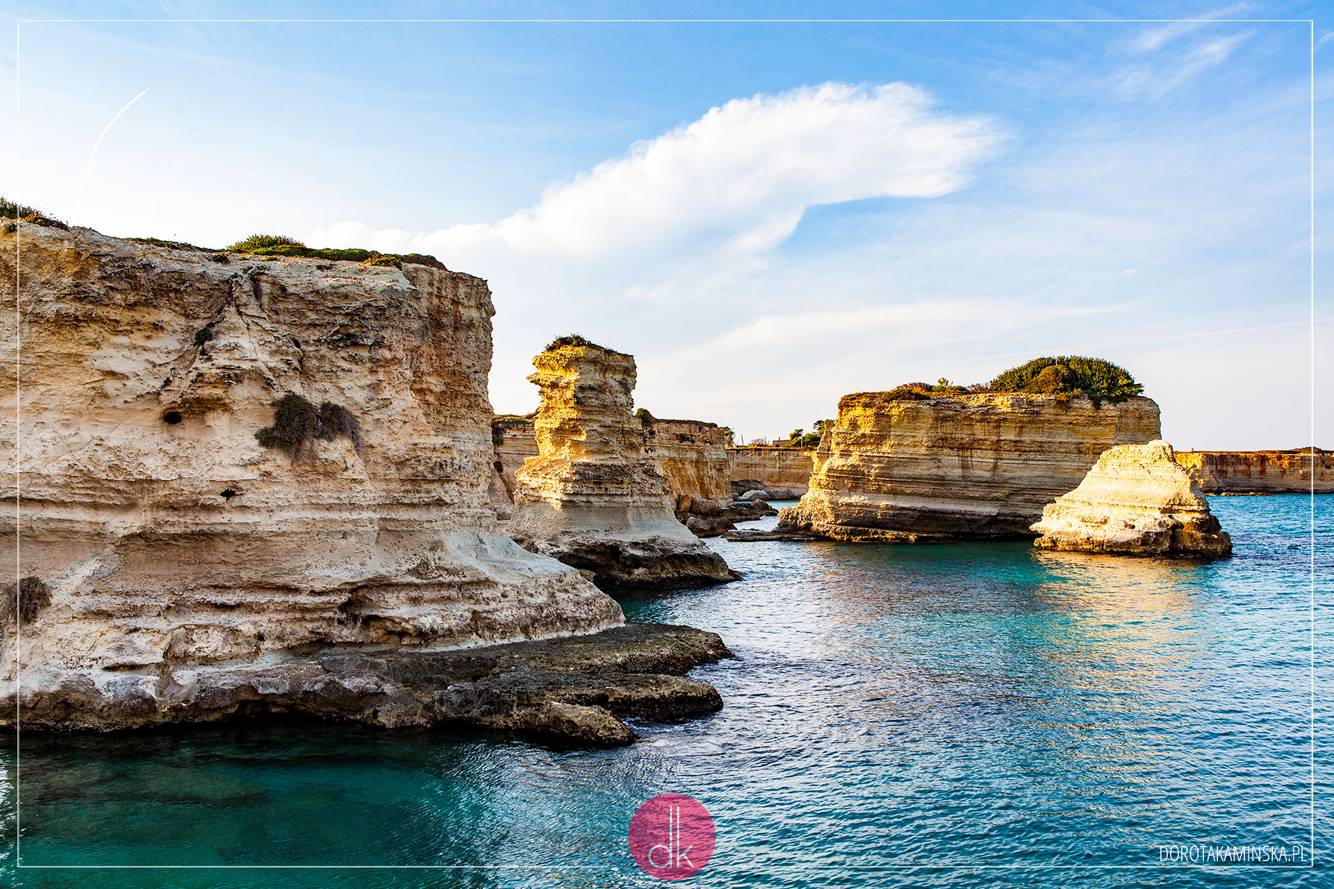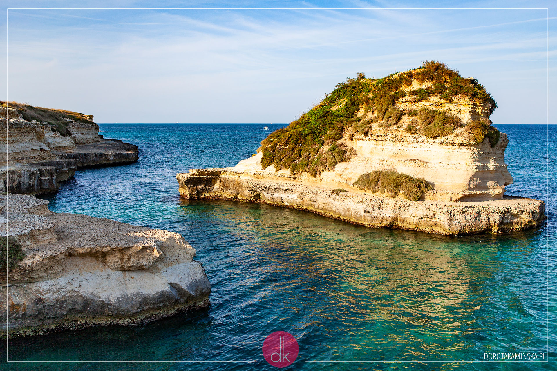 Z Alberobello wyruszyliśmy na wschodnie wybrzeże do miejscowości Sant’Andrea. Chcieliśmy poszukać pięknych formacji skalnych przy plażach. Bo, poza urokliwymi miasteczkami, „obcas” mapy Włoch to raczej monotonne i mało ciekawe krajobrazy. Przynajmniej tam, gdzie jeździ się autem. Po w miarę głównych drogach. I znaleźliśmy owe skały, chociaż zaczęliśmy się zastanawiać, czy warto było specjalnie do nich gonić…