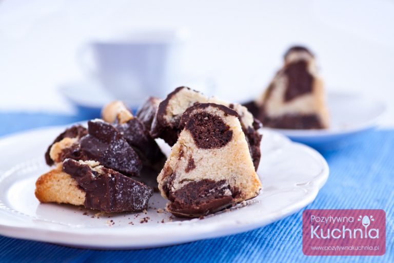 Zamiast przygotowywać dwie osobne masy, podzielcie wszystkie składniki (oprócz kakao) na dwie równe części, a z jednej z nich, tej przeznaczonej do przygotowania kakaowej masy, odsypcie 2 łyżki mąki. Wyrówna to ciężar obu mas i zmniejszy ryzyko powstania zakalca w kakaowym cieście po dosypaniu kakao. Oprócz tego ułatwi przygotowanie cieniowanego, marmurkowego wzoru tym z Was, którzy zdecydują się na eksperyment z mieszaniem nieupieczonej masy za pomocą drewnianego patyczka. Ciekawa jestem, który sposób nakładania masy wybierzecie.