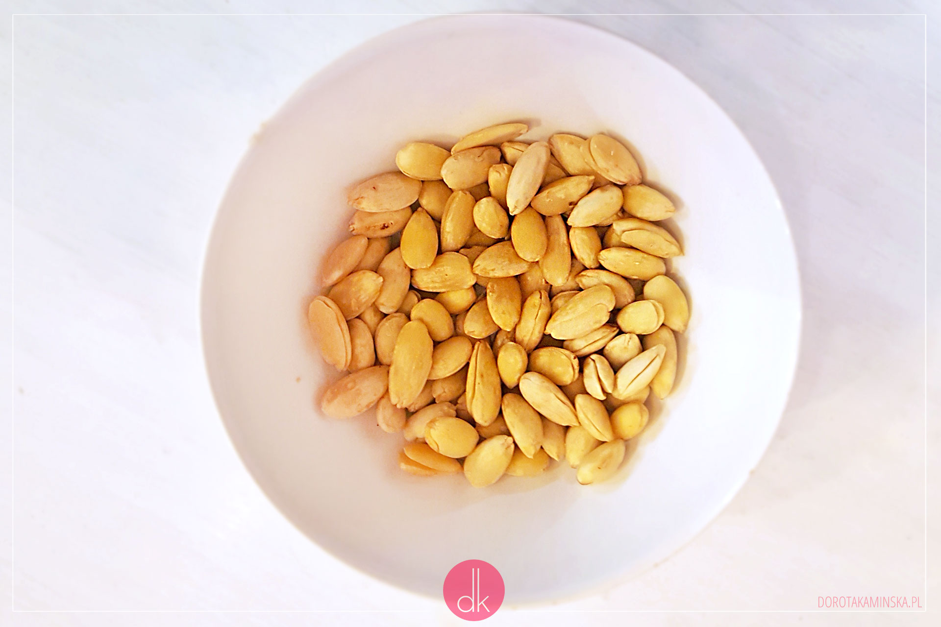 - Migdały zalewam gorącą wodą tak, żeby całkowicie wszystkie przykryć. Gotuję przez 30 sekund.