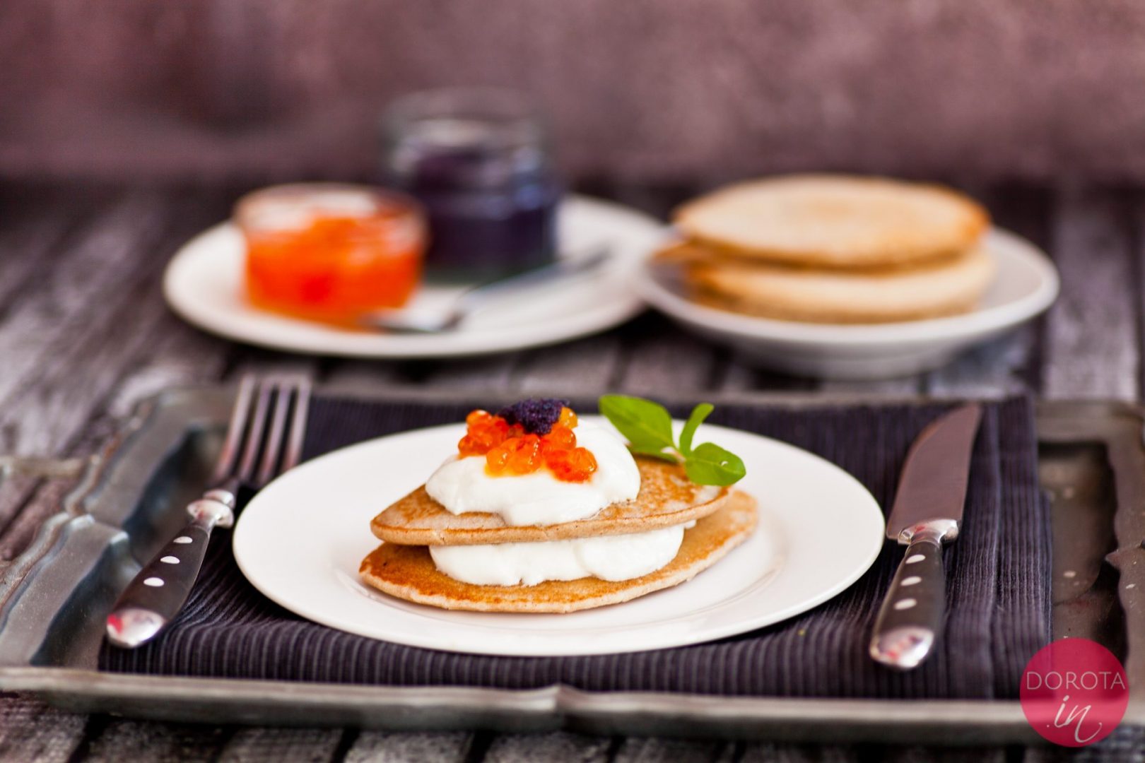Moje bliny z kawiorem przygotowałam z ciasta gryczano-żytniego. Te z dodatkiem mąki pszennej będą lżejsze i bardziej puszyste, ze względu na więcej glutenu. W wersji bezglutenowej można je usmażyć ciasta wyłącznie z mąki gryczanej. Sprawdziłam, również są smaczne, chociaż część z Was może potrzebować nieco się przestawić, jeśli dotychczas jedliście jedynie wypieki z jasnej mąki.