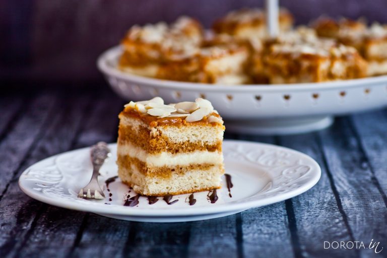 - Na wierzchu ciasta rozsmarowujemy kajmak i posypujemy go płatkami migdałów.