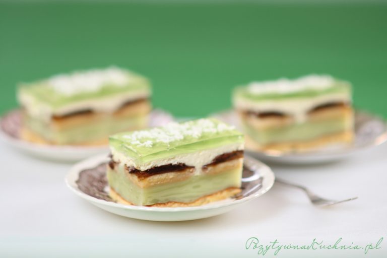 - Ciasto Shrek trzymam w chłodnym miejscu aż wierzchnia warstwa całkowicie stężeje, następnie kroję i podaję. Po wierzchu można posypać wiórkami kokosowymi.