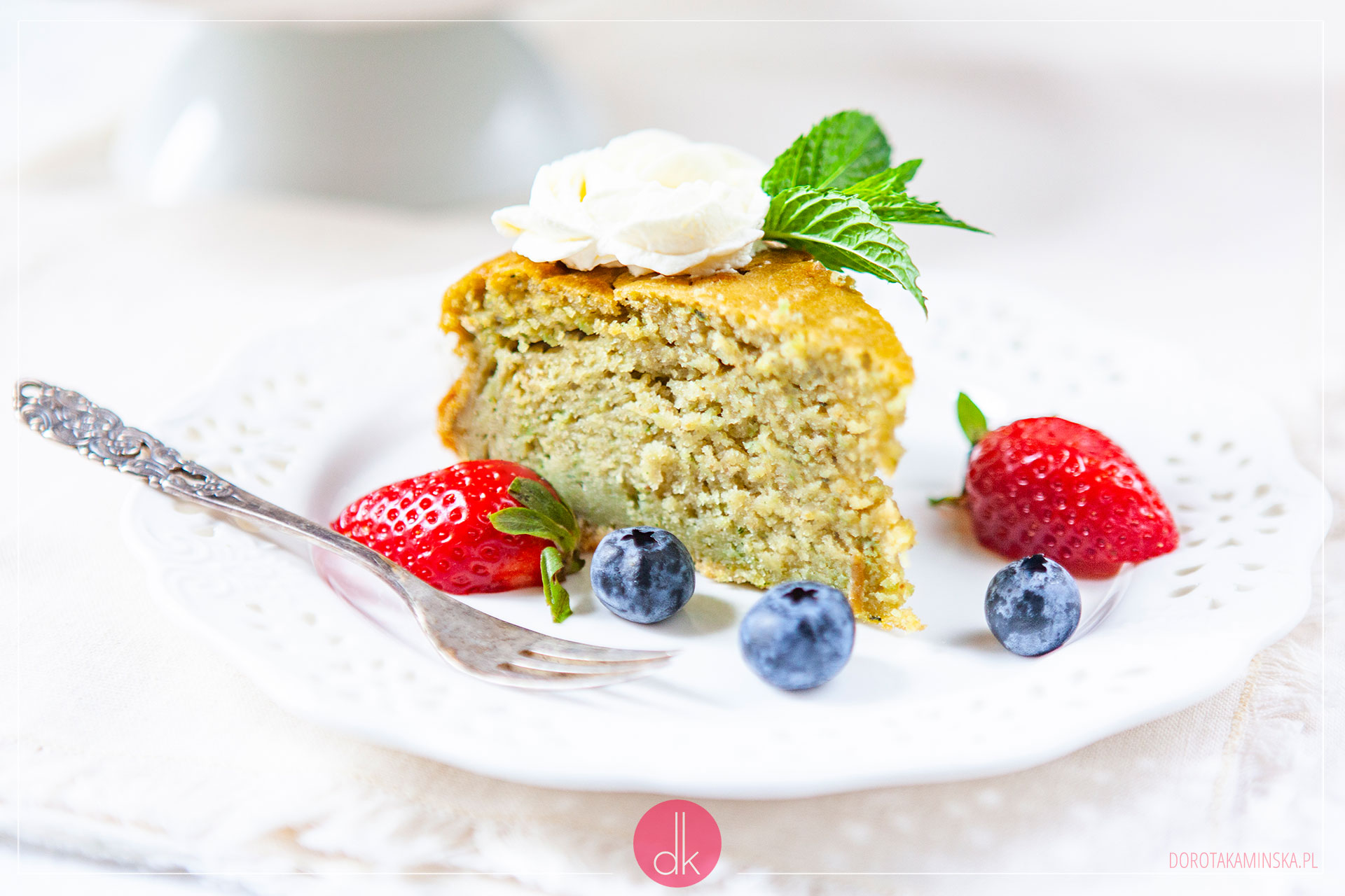 Ta receptura to zmodyfikowana, choć w sporym stopniu, wersja ciasta marchewkowego. Nie ma tu jednak korzennych przypraw. Zamiast tego jest delikatnie kwaskowaty posmak, który świetnie przełamuje słodycz ciasta i łagodny smak kremu. Zielony kolor cieszy oko, a kolorowe owoce stworzą z nim wyjątkowo apetyczną mieszankę. I z pewnością taki widok ucieszy oko, a potem smak podbije niejedno serce :).