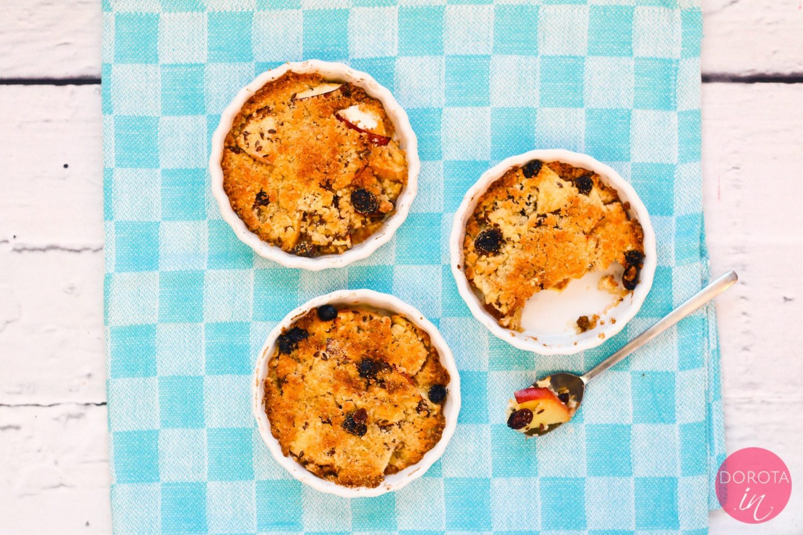 Można zrobić najprostsze crumble jabłkowe, skrapiając owoce sokiem z cytryny lub pomarańczy, delikatnie dosładzając w razie potrzeby i posypując kruszonką, choć polecam poeksperymentować z dodatkiem przypraw: oprócz cynamonu świetnie sprawdzi się wszystko, co w piernikach: imbir, goździki, gałka muszkatołowa, czarny pieprz, chili i kolendra… ważne, żeby te ostre były dodawane w najmniejszych ilościach.