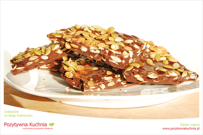 Ja przygotowałam czekoladę Azteków w wersji „stałej” – bardziej do chrupania niż do picia, choć również taką można zrobić, zwłaszcza że gorąca czekolada z chili, posypana prażoną dynią, o tej porze roku jest czasem bardzo potrzebna :). Smakowała wybornie, a przygotowuje się ją w najłatwiejszy chyba sposób na świecie.