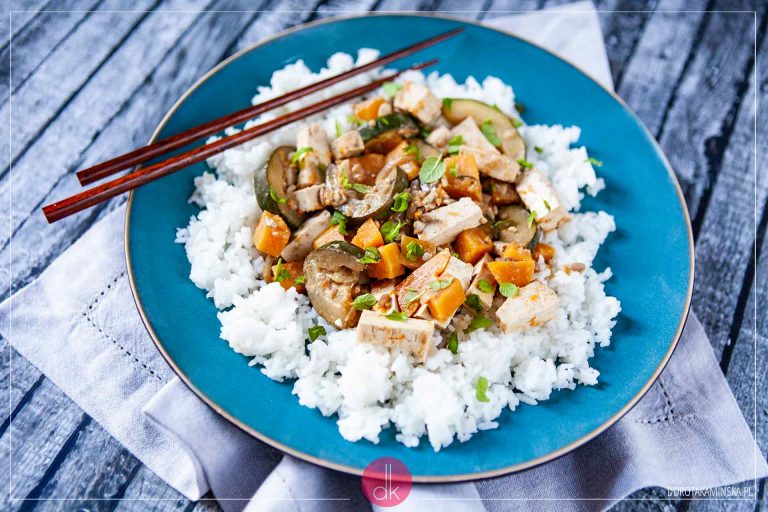 - Podaję z ugotowanym ryżem, posypane kolendrą i papryczką chili.
