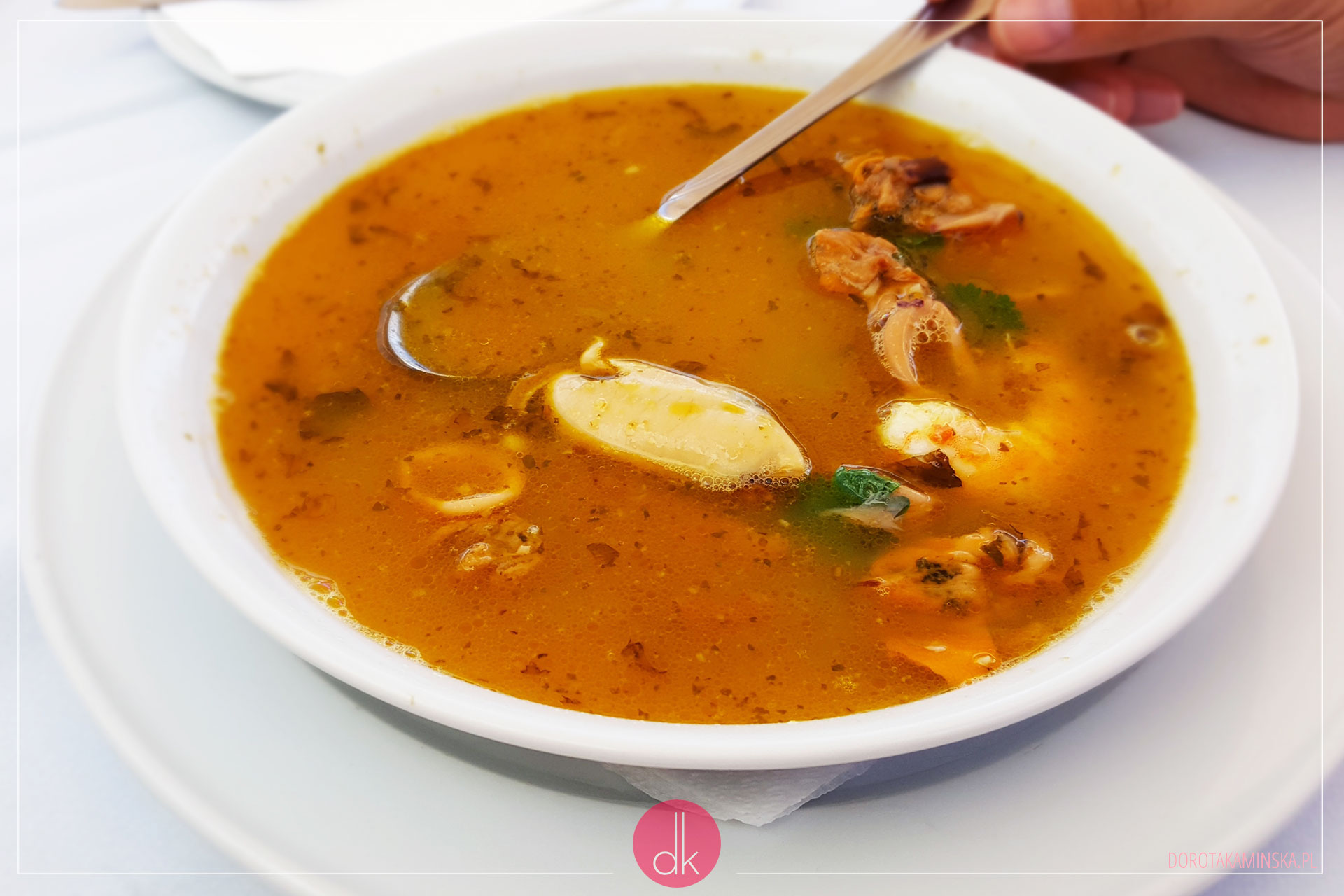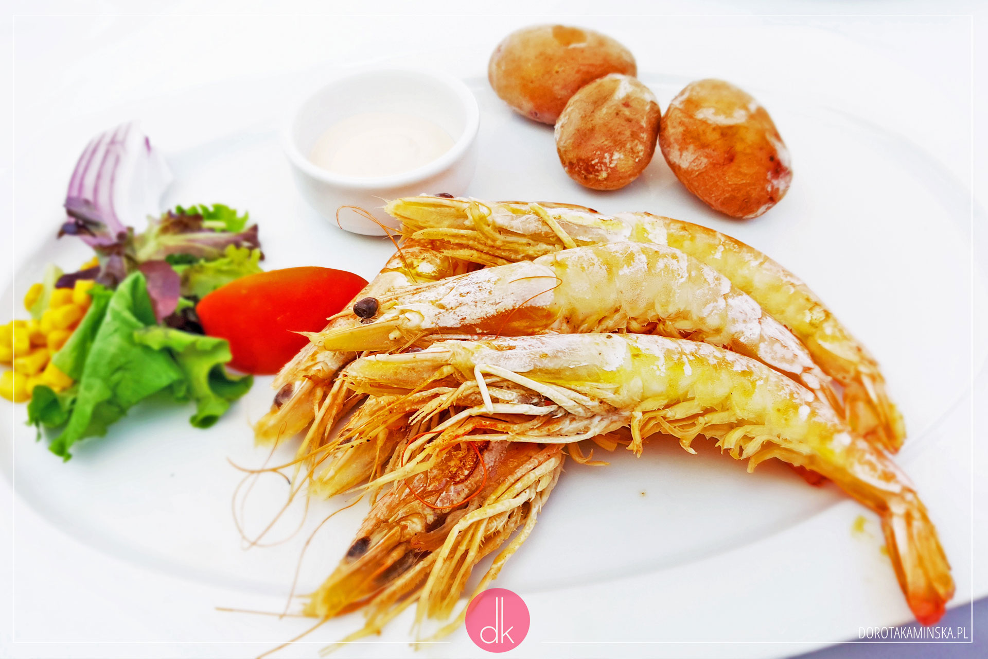 3. El Roque de Los Pescadores, El Cotillo. Tylu panów, ilu uwijało się dookoła nas, nie obsługiwało nas w żadnej innej restauracji. Młodzi chłopcy, którzy witają i wskazują stolik, zbierają zamówienia oraz przynoszą dania. Starsi panowie: jeden od napojów, a drugi od polecania potraw i upewniania się, że wszystko jest w porządku. Wszyscy uśmiechnięci i chętni do nauki słówek po polsku. Jedzenie przepyszne: zupa z ryb i owoców morza oraz krewetki z grilla doskonałe.