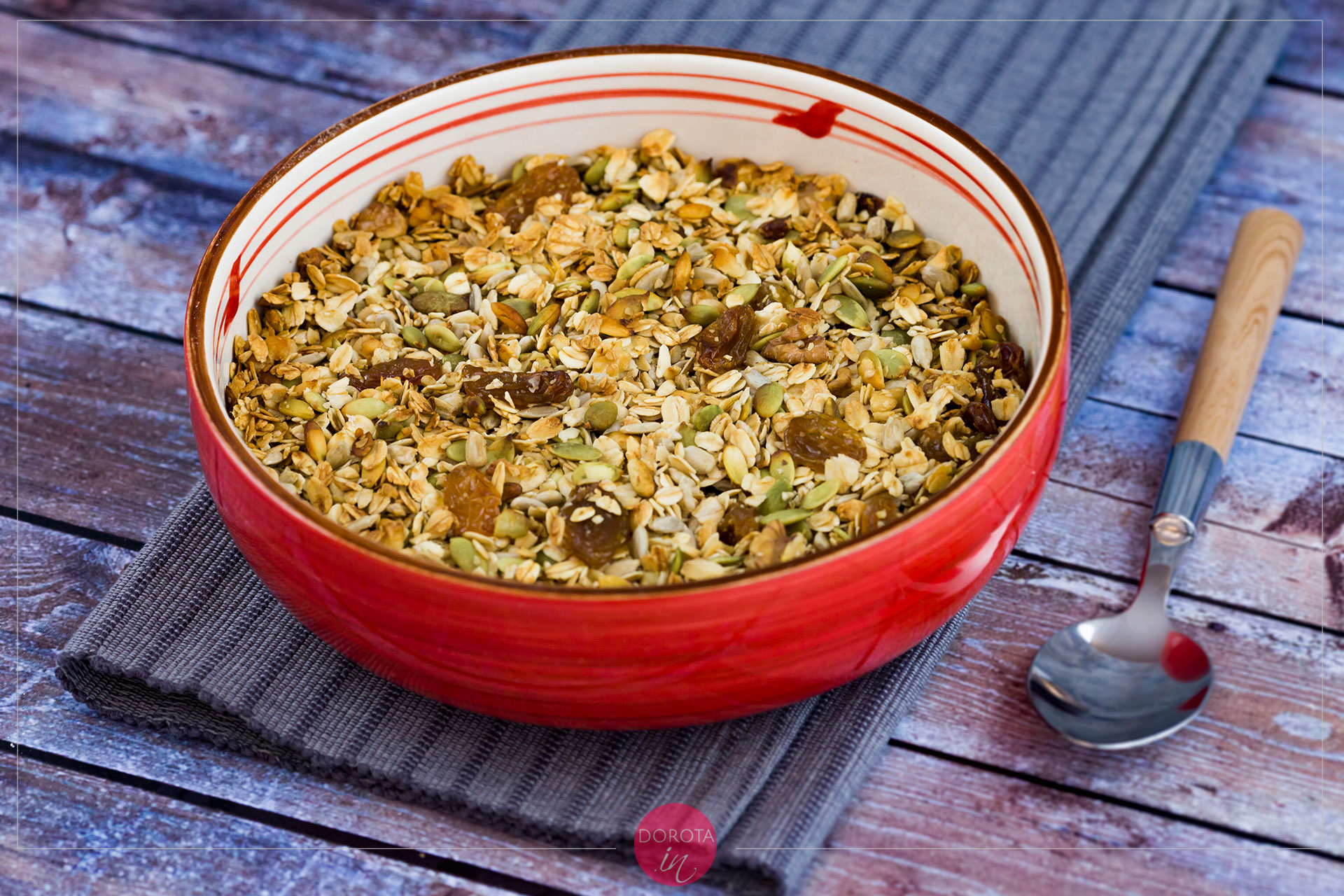 Domowa granola to najlepszy pomysł na dobry początek dnia. Osobiście polecamy także dodać płatki orkiszowe. Zdrowo i smacznie.