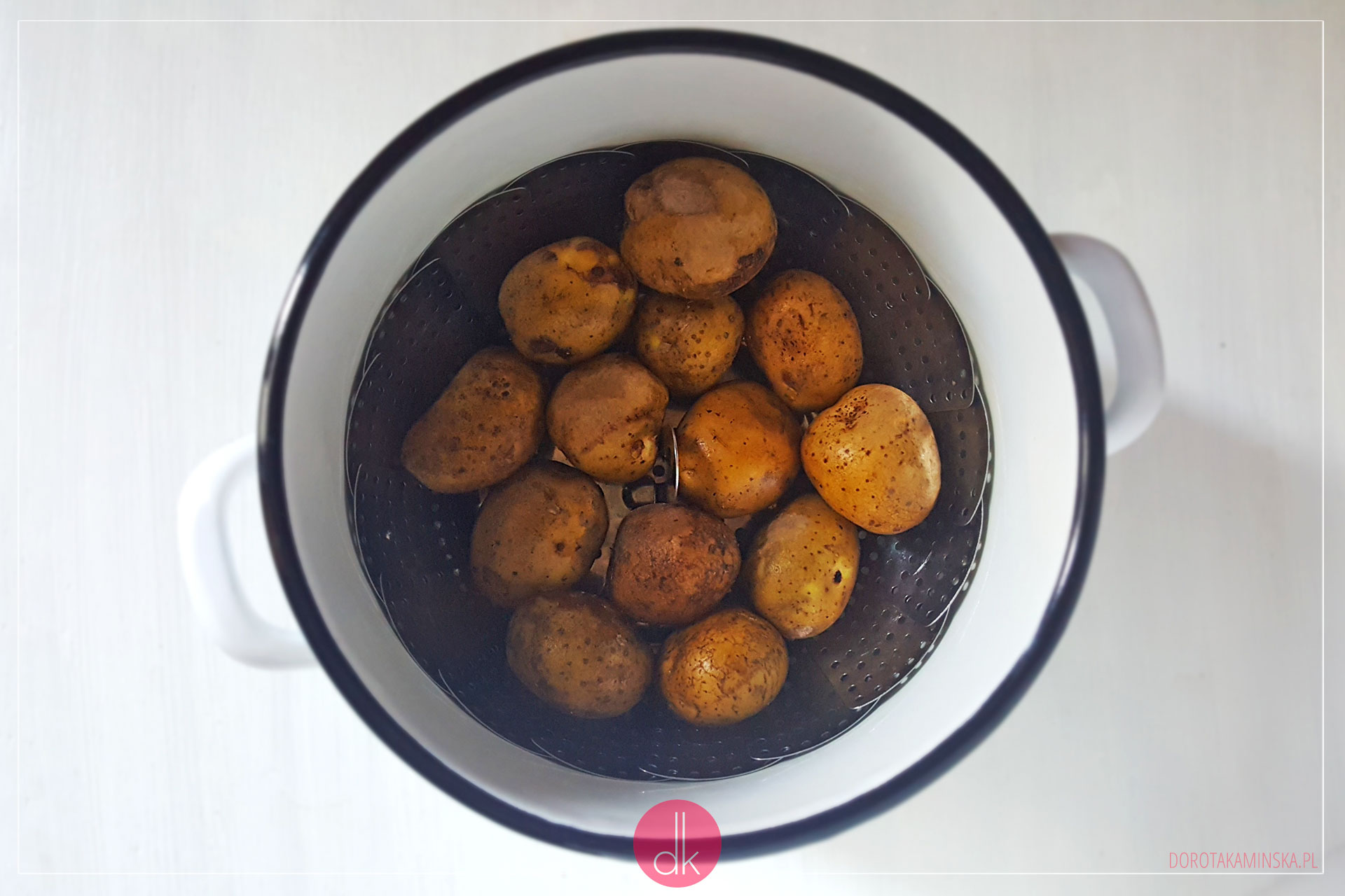 - Ziemniaki wkładam do garnka na wkładkę/durszlak, obsypuję solą i przykrywam.
