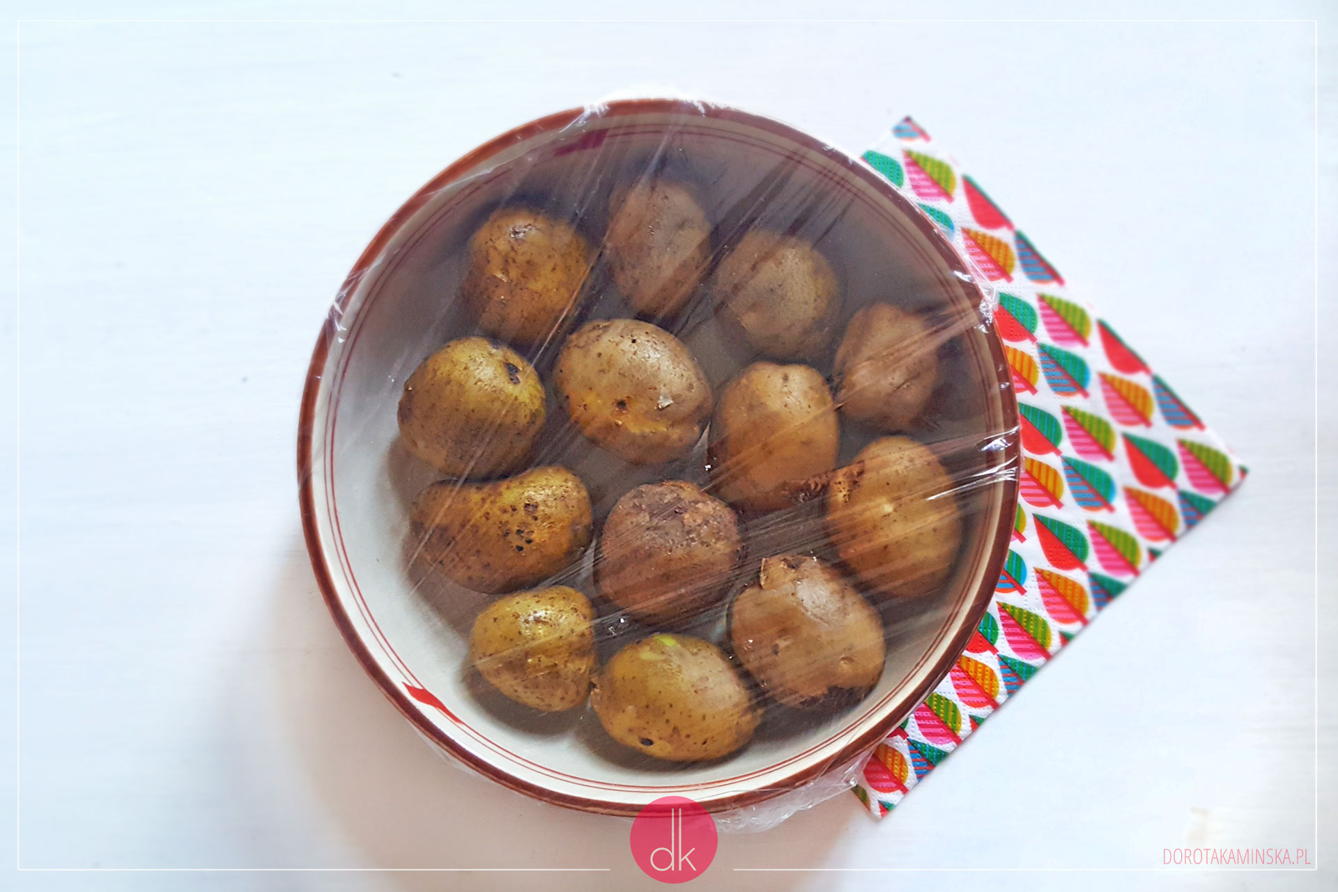 - Oblewam ziemniaki kilkoma łyżkami wody, przykrywam naczynie folią przeznaczoną do kuchenek mikrofalowych i na wysokiej mocy gotuję przez ok. 5-10 minut (mniejsze, młode ziemniaki ugotują się szybciej niż większe, starsze).
