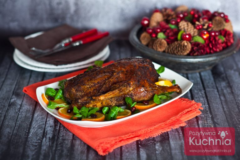 Najlepsza, pieczona kaczka z żurawiną, z farszem z dodatkiem selera naciowego, jabłek, aromatycznych ziół i chrupiących orzechów włoskich, miękka w środku i z chrupiącą skórką.