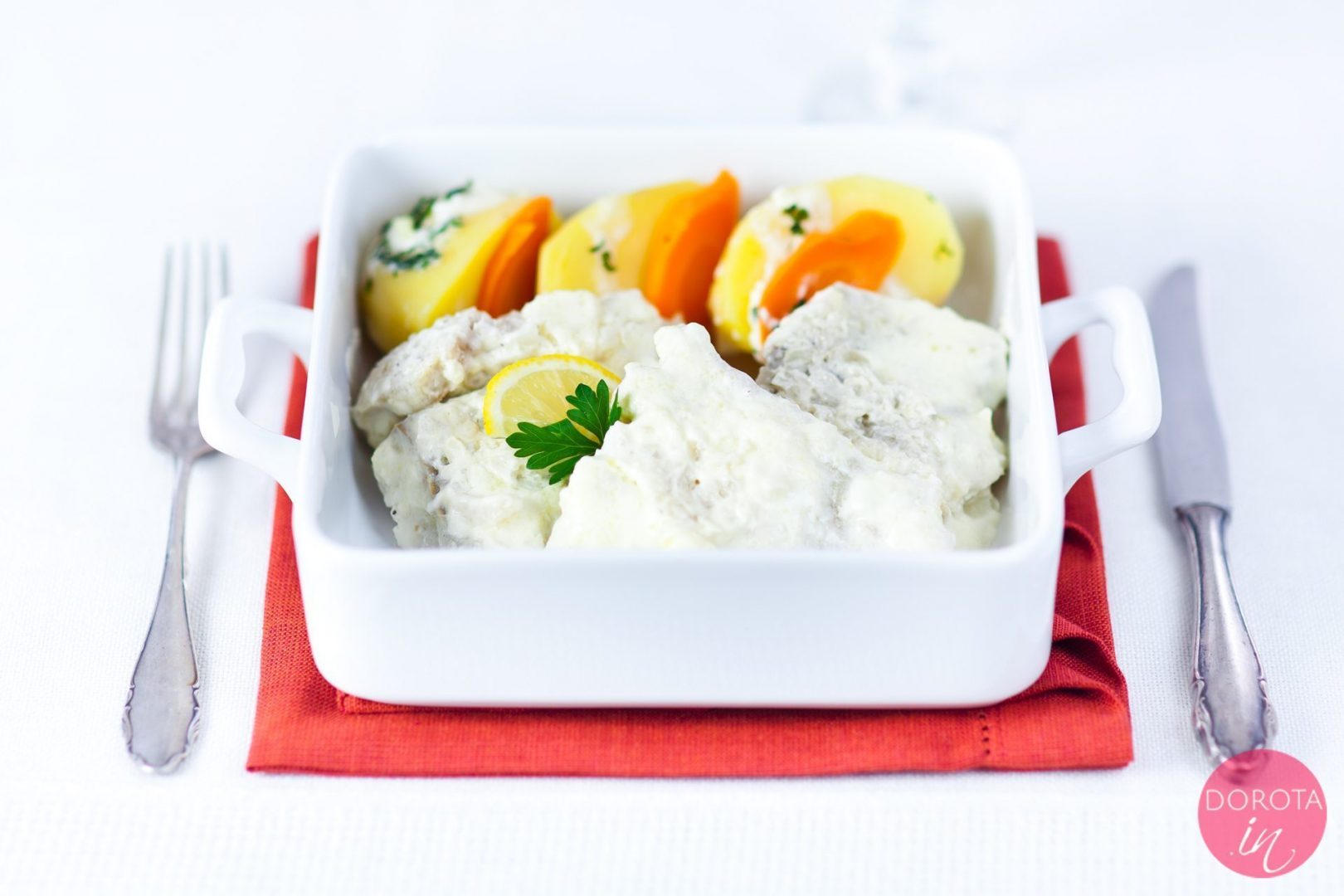Zamiast w śmietanie, można udusić go w jogurcie naturalnym. To z pewnością znacznie obniży kaloryczność całego dania i zmniejszy jego tłustość. Białe mięso ryby w sosie, a do tego gotowane ziemniaki i marchewka. Łagodna ryba i warzywa oraz lekko kwaśny sos.