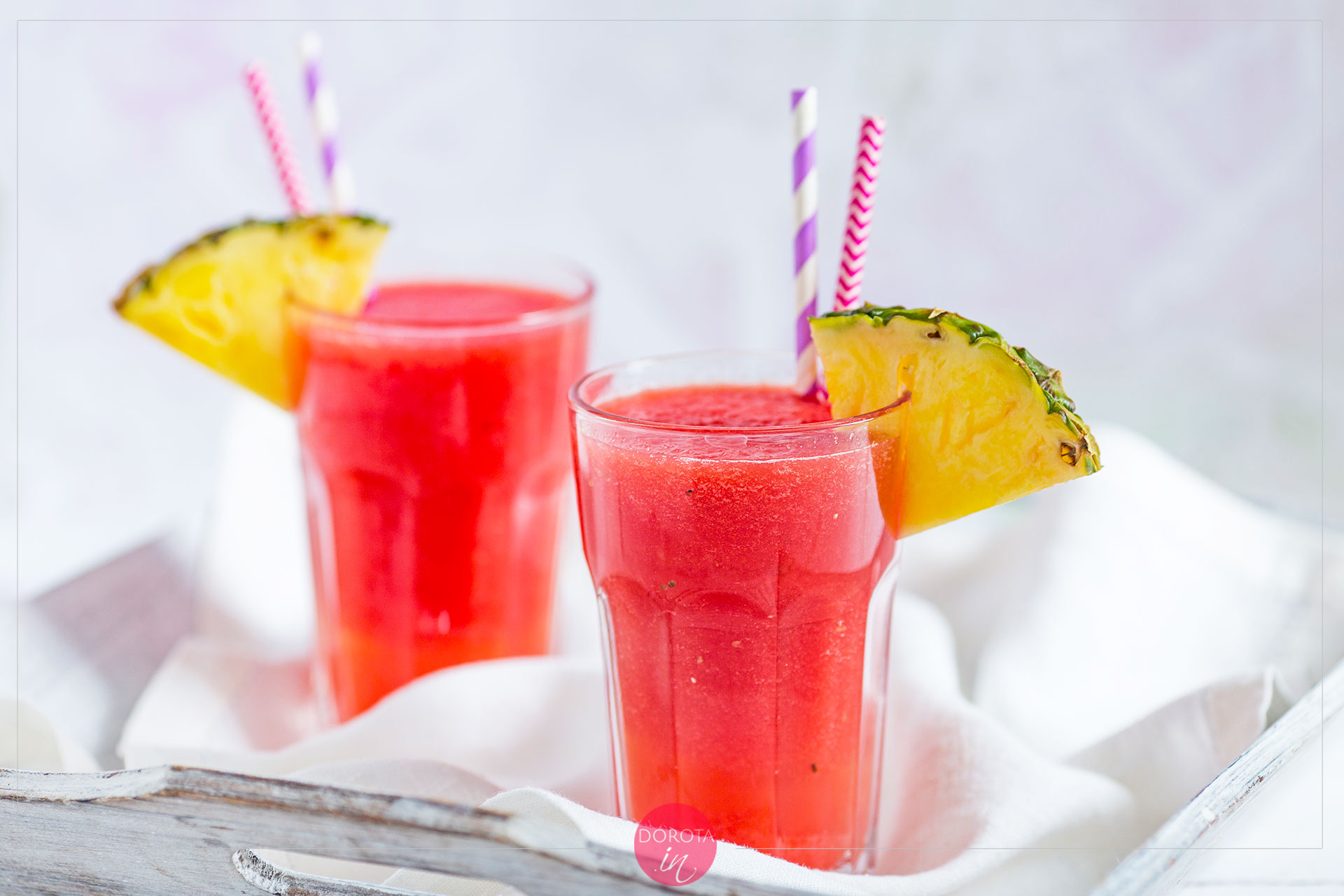 - Koktajl podaję w wysokich szklankach, ozdobiony kawałkiem arbuza, ananasem i listkiem mięty.