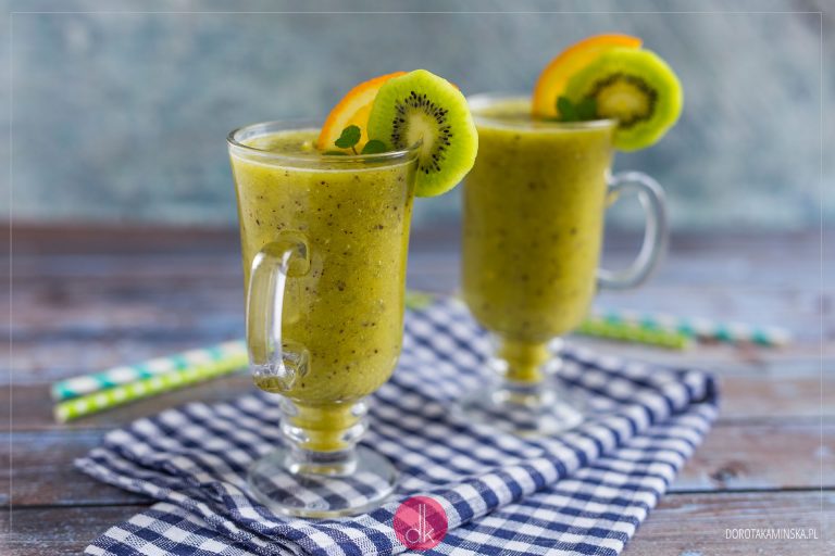 Takie zielone smoothie z kiwi jest słodkie dzięki dojrzałym bananom. Dlatego w sklepie zawsze lubię wybierać te o mocno poplamionej skórce, wyjątkowo słodkie. Często zastępuję nimi cukier w słodkich deserach czy wypiekach oraz właśnie w koktajlach. Za sprawą kiwi, oprócz zielonego koloru, koktajl ma mnóstwo witamin. Kwaskowaty smak pomarańczy sprawia, że całość jest wyjątkowo orzeźwiająca. Jeśli nie przepadacie za mlecznymi koktajlami, ten przypadnie Wam do gustu!
