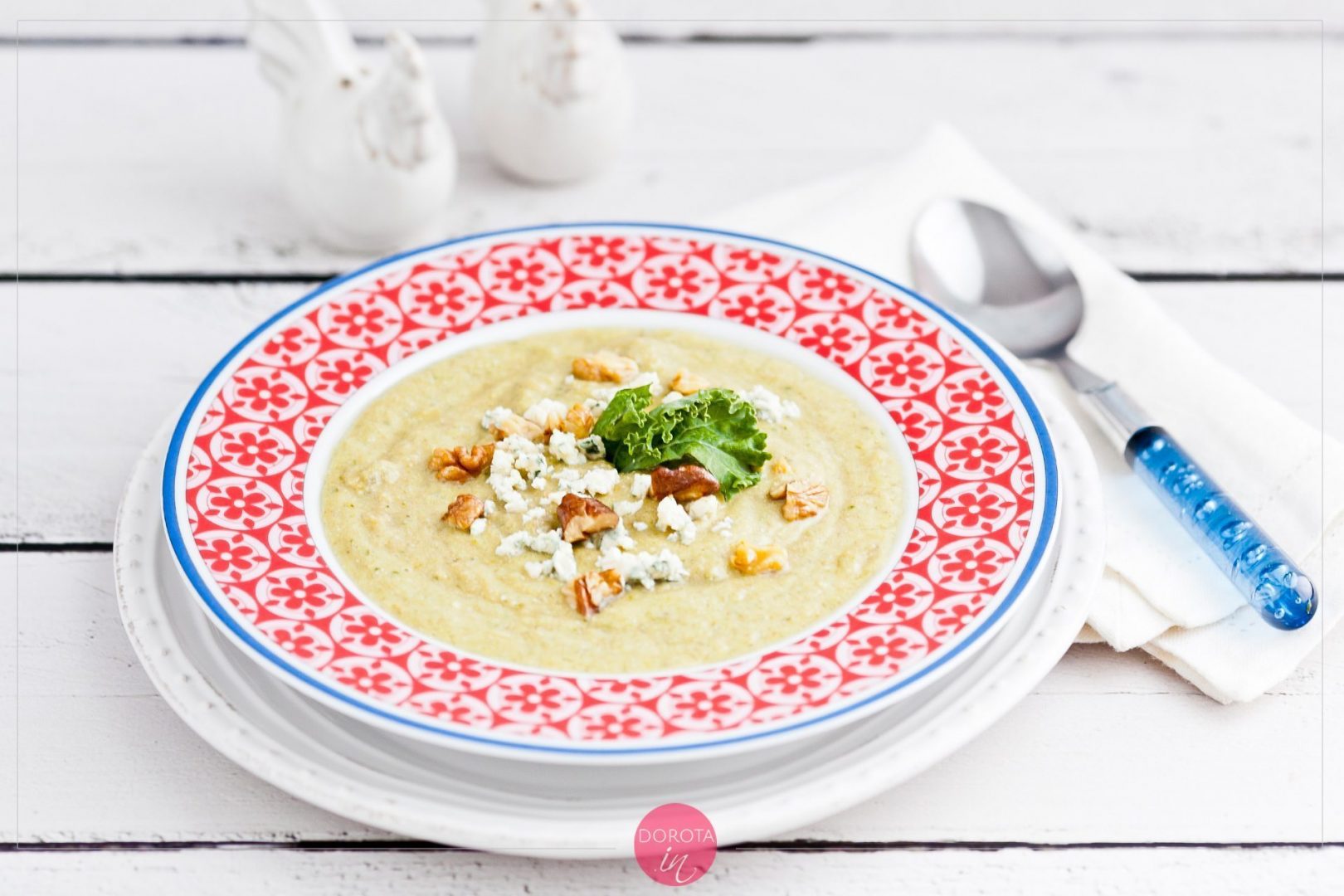 - Serwuję krem z jarmużu na talerzach, udekorowany jarmużowymi listkami lub chipsami, prażonymi orzechami lub słonecznikiem, albo migdałami oraz kawałkami sera.