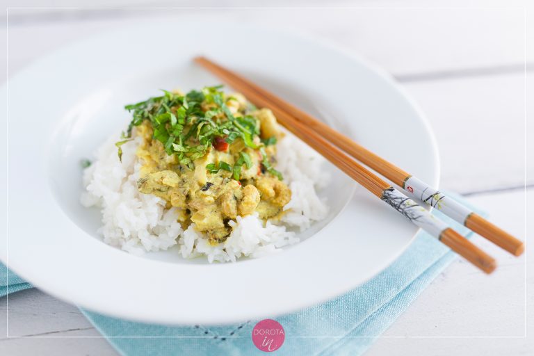 Moje krewetki z mlekiem kokosowym to smak kuchni indyjskiej, choć z rozpędu podałam je bezpośrednio na ryżu i zaserwowałam do zjedzenia za pomocą pałeczek. Tak to już jest z zakochaniem, człowiek traci resztki rozsądku!
