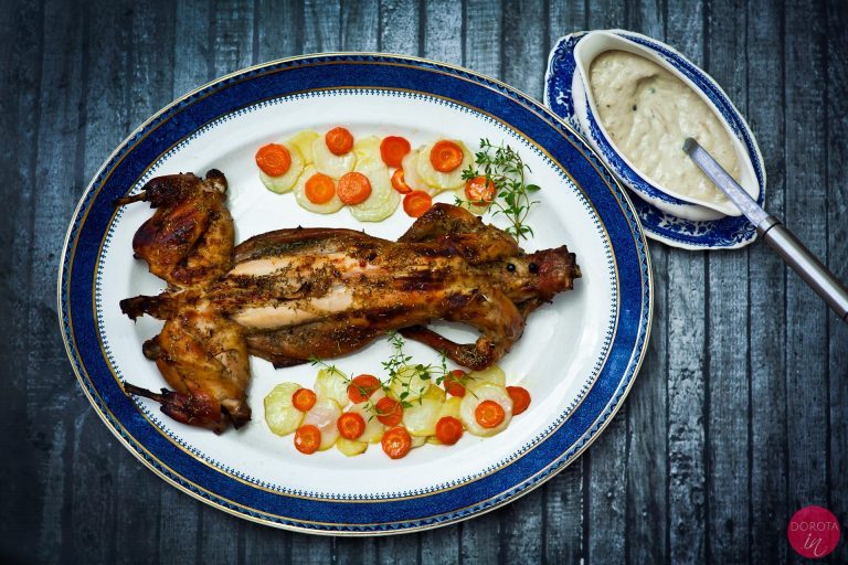 - Królika serwujemy na półmisku, z dodatkiem pieczonych warzyw i sosem przelanym do sosjerki.