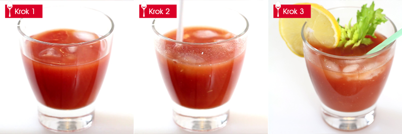 - Wysoką szklankę typu collins wypełniam do ⅓ wysokości lodem, wlewam wódkę i dopełniam sokiem pomidorowym.