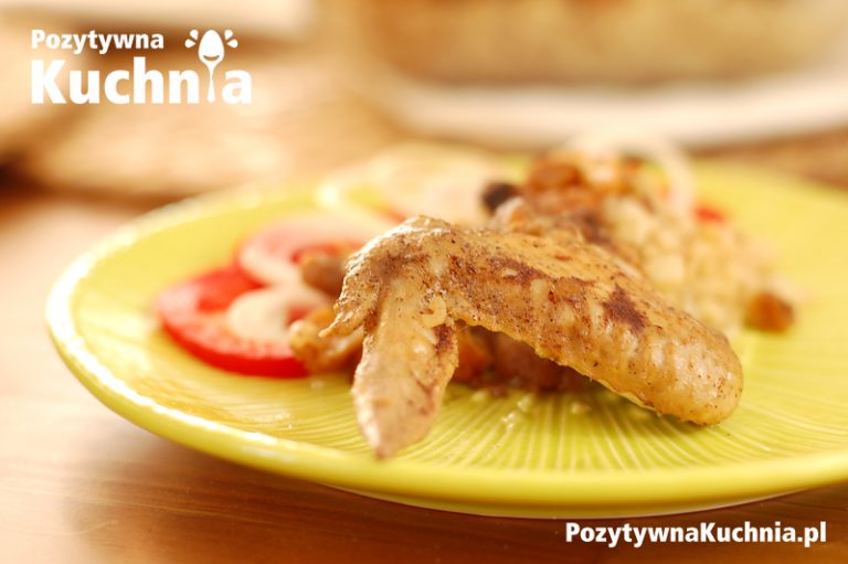 - Na wierzchu kładę skrzydełka, polewam powstałym podczas duszenia sosem, razem z owocami.