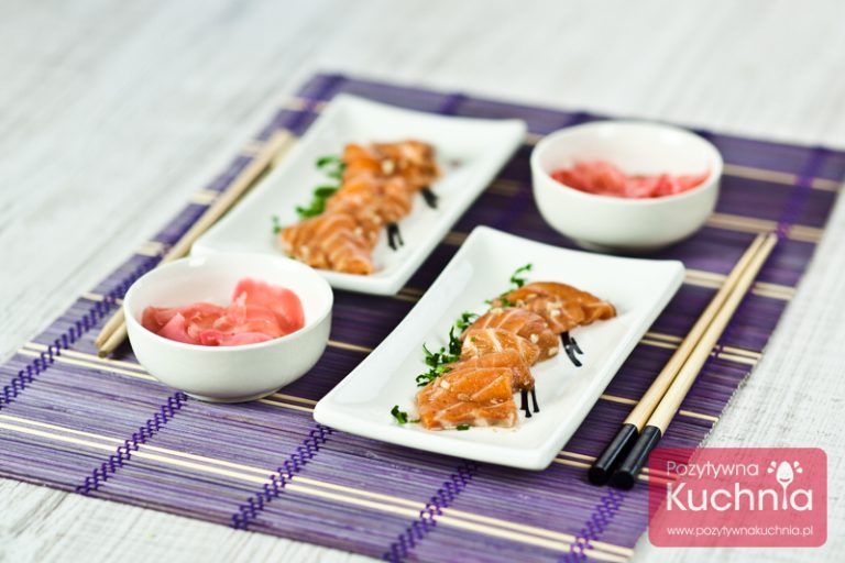 Łosoś marynowany jest wyjątkowo prosty do przygotowania i nie wymaga długiego czasu oczekiwania. Wystarczy odpowiednio pokroić surową rybę i zanurzyć ją na 15 minut w kilkuskładnikowej marynacie. Polecam gorąco zaserwować go z marynowanym imbirem! Dodatkowo można też oczywiście dołożyć do niego ugotowany ryż. Sposób podania dokładnie w taki sam jak w przypadku ryżu na sushi: można ulepić z wystudzonego kilka dekoracyjnych kulek, położyć obok sałatkę z glonów, kiełki, kilka plasterków cytryny…