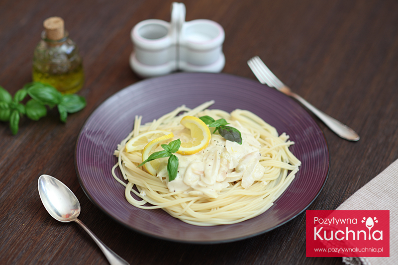 - Sosem polewam wyłożony na talerze makaron, ozdabiam plasterkami cytryny i bazylią i podaję. Można też przełożyć makaron na patelnię z sosem i wymieszać całość przed nałożeniem na talerze.
