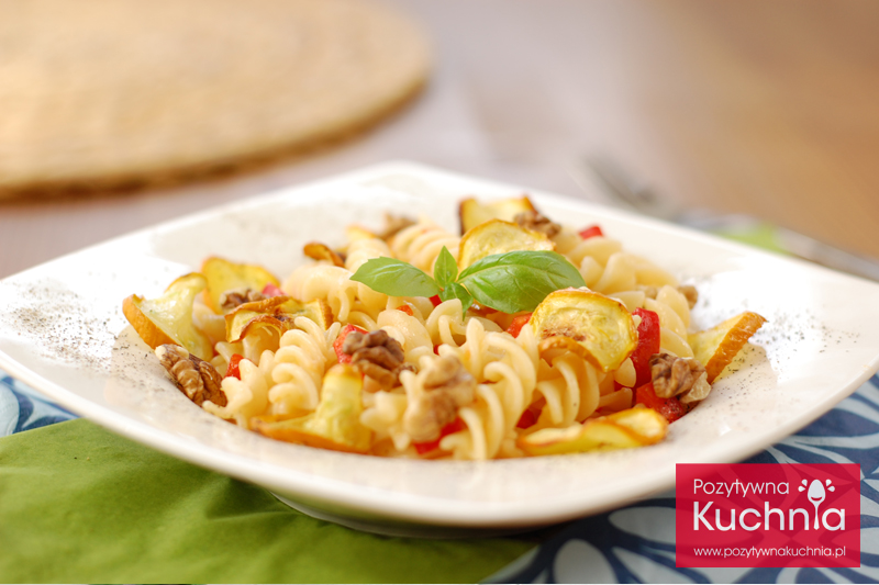 Kiedy cukinia grilluje się w piekarniku lub na grillu, można przygotować pozostałe składniki: ugotować makaron, pokroić i zeszklić cebulę i paprykę. Całość można potem wymieszać w misce, chociaż osobiście wolę osobno ułożyć na talerzach, na makaronie, plasterki cukinii i udekorować listkami bazylii i pieprzem.