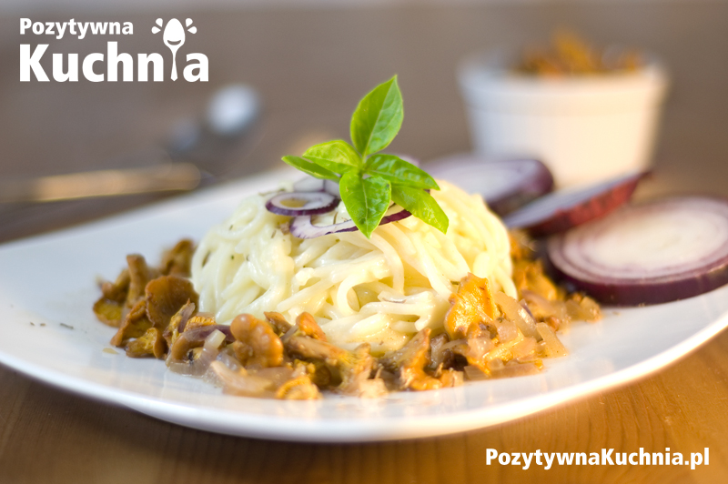 - Układamy makaron na talerzach, dookoła ozdabiam kurkami i posypuję szczyptą ziół prowansalskich. Na wierzchu można położyć kilka krążków cebuli oraz listki bazylii.