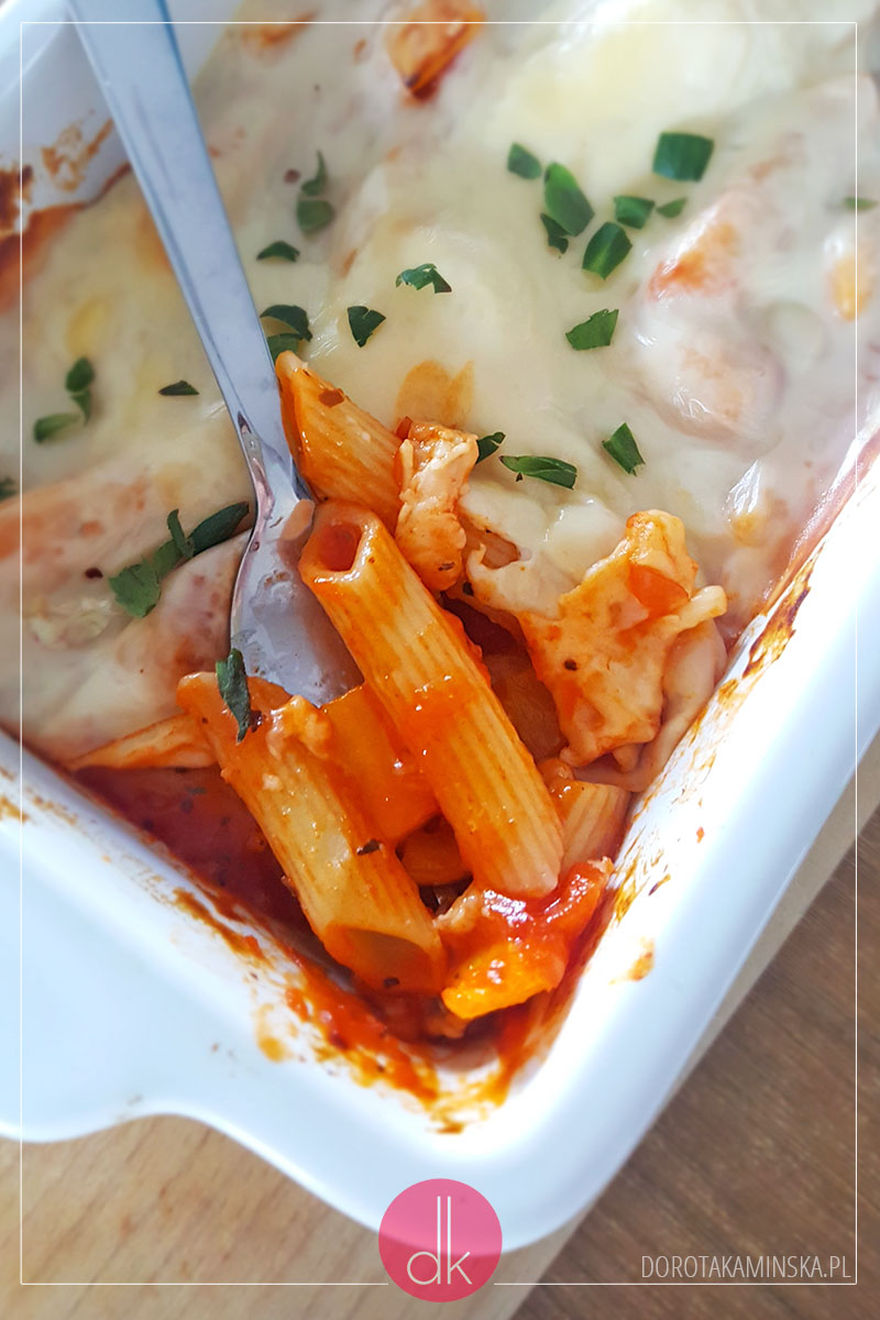 Pożywny obiad na niepogodę – makaron zapiekany z sosem pomidorowym z dodatkiem mozzarelli, parmezanu i ziół. Syci i rozgrzewa, co w maju, przy temperaturach nadal bliskich zera, jest na wagę złota!