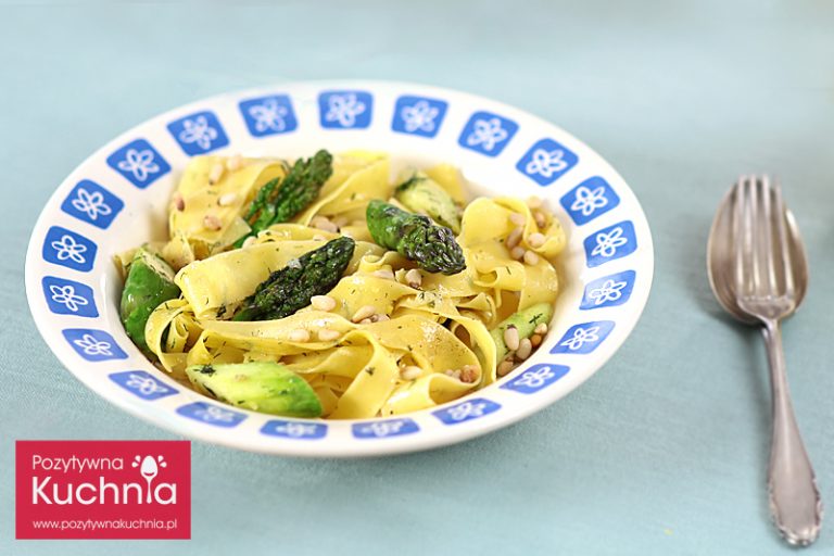 Makaron ze szparagami w wersji nieco „cięższej”, zamiast posypywać świeżym koprem, można polać sosem śmietankowo-koperkowym przygotowanym według przepisu na tagliatelle z łososiem.