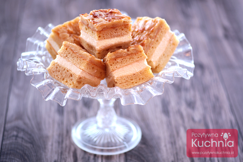 To nietrudne do przygotowania ciasto, które wyrasta dzięki dodatkowi do masy proszku do pieczenia. Ponieważ jego wierzch jest dość mocno słodki i tłusty, można spróbować dodać nieco mniej cukru do kremu i samego ciasta. Złocisty wierzch kusi, żeby wziąć jeszcze jeden kawałek! Pierwszy kęs to przełamanie chrupkości i natychmiastowa słodycz, której towarzyszy delikatne i miękkie ciasto oraz łagodny krem. Kolejne to już uzależnienie ;).