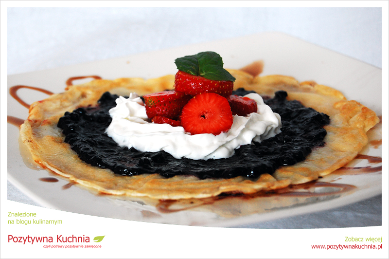 Pierwsza wersja to polewa rozlana na talerzu, położony na wierzch naleśnik, warstwa dżemu, chmurka bitej śmietany i świeżutkie, słodkie truskawki. A na szczycie tej słodkiej piramidy pachnące listki mięty.