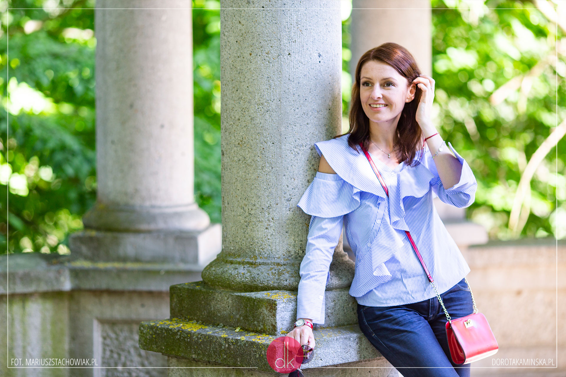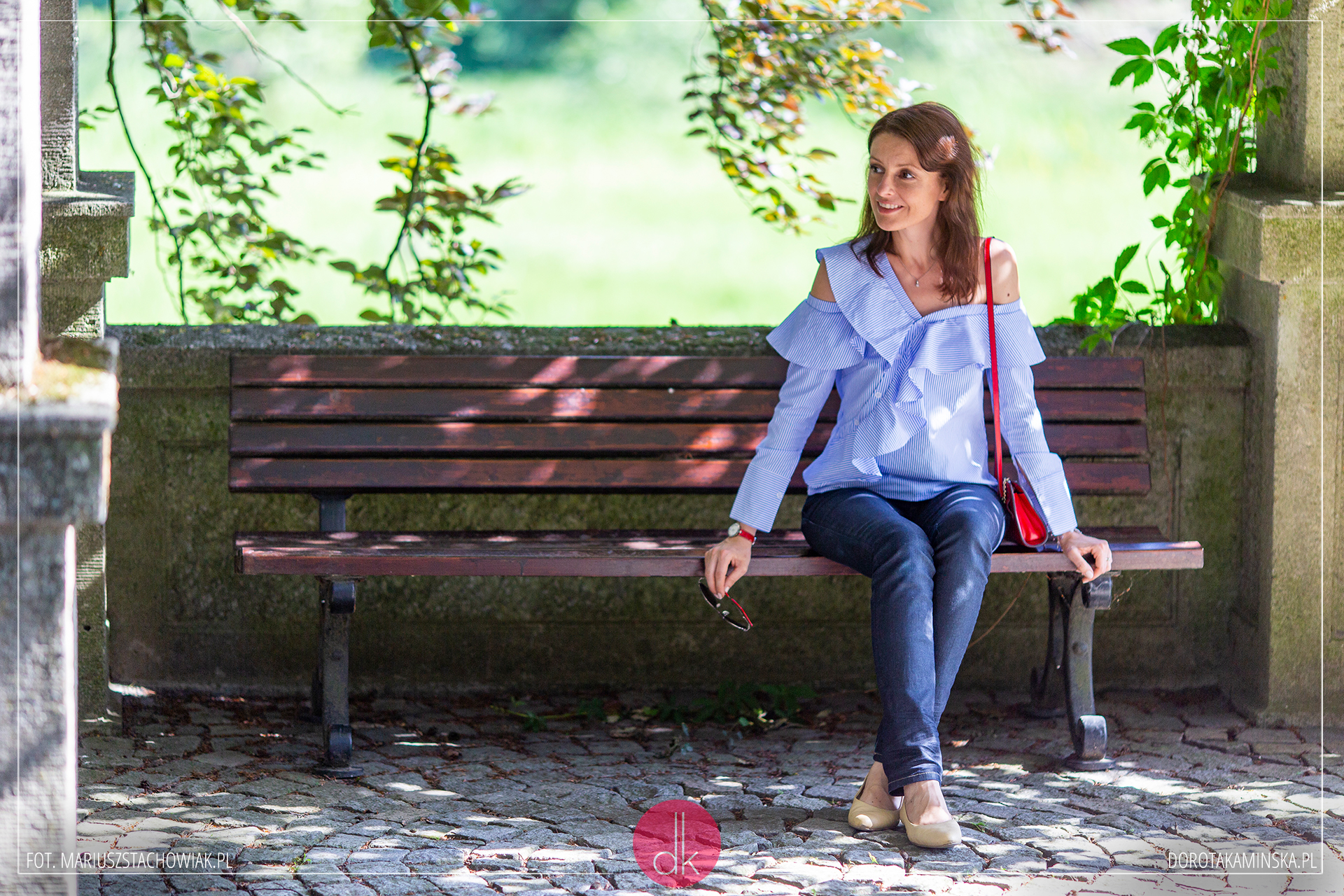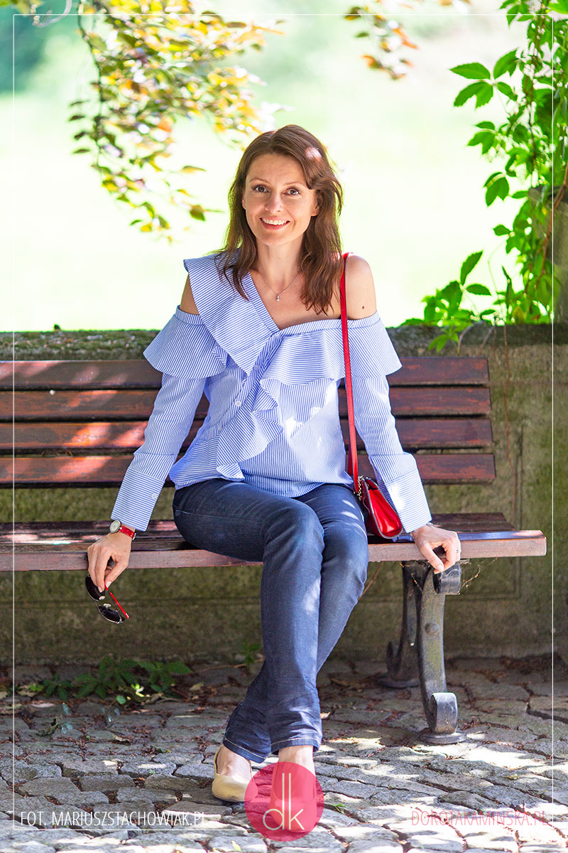 Próbowałam zestawić tę bluzkę z białymi dżinsami, ale o wiele bardziej lubię ją nosić do granatowych. Stawiam na bezpieczne połączenie z beżowymi balerinami, a do tego moja ulubiona czerwień: na torebce, pasku od zegarka i bransoletce. Myślę, że moja niebieska bluzka w paski z odkrytym ramieniem będzie też bardzo ładnie pasować do czarnej spódnicy ołówkowej i szpilek – jak uważacie?
