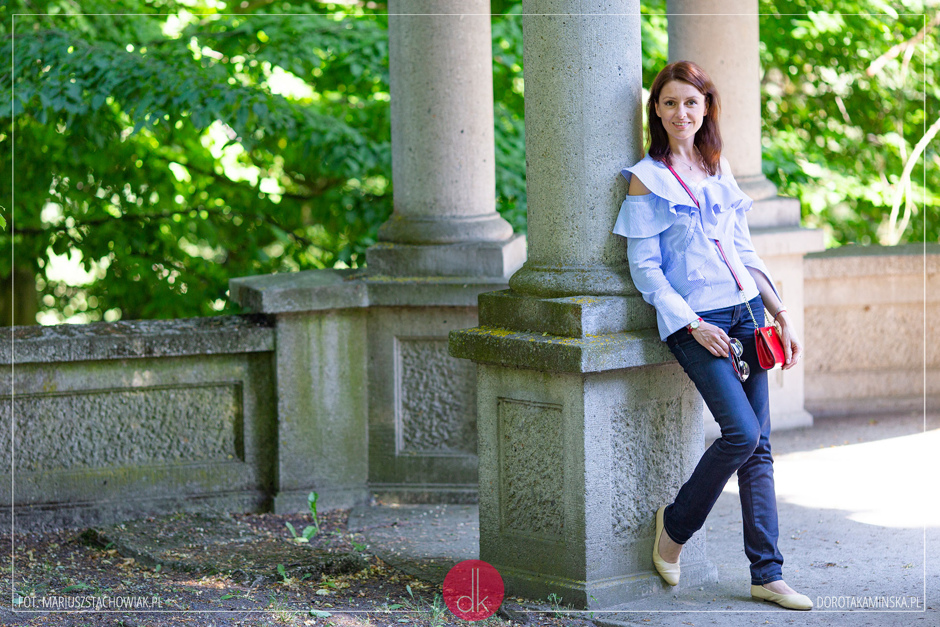 Wielokrotnie zachwalana przez Was na moim Instagramie, w końcu doczekała się sesji zdjęciowej. Mariusz zabrał mnie ze sobą w plener ślubny i zanim w pałacu pojawiła się młoda para, przespacerowaliśmy się w poszukiwaniu miejsc do ładnych kadrów. Piękny, letni dzień i aż prosiło się o szorty lub spódnicę, jednak długie spodnie o wiele lepiej sprawdzają się u asystentki fotografa, która biega dookoła młodej pary ;).