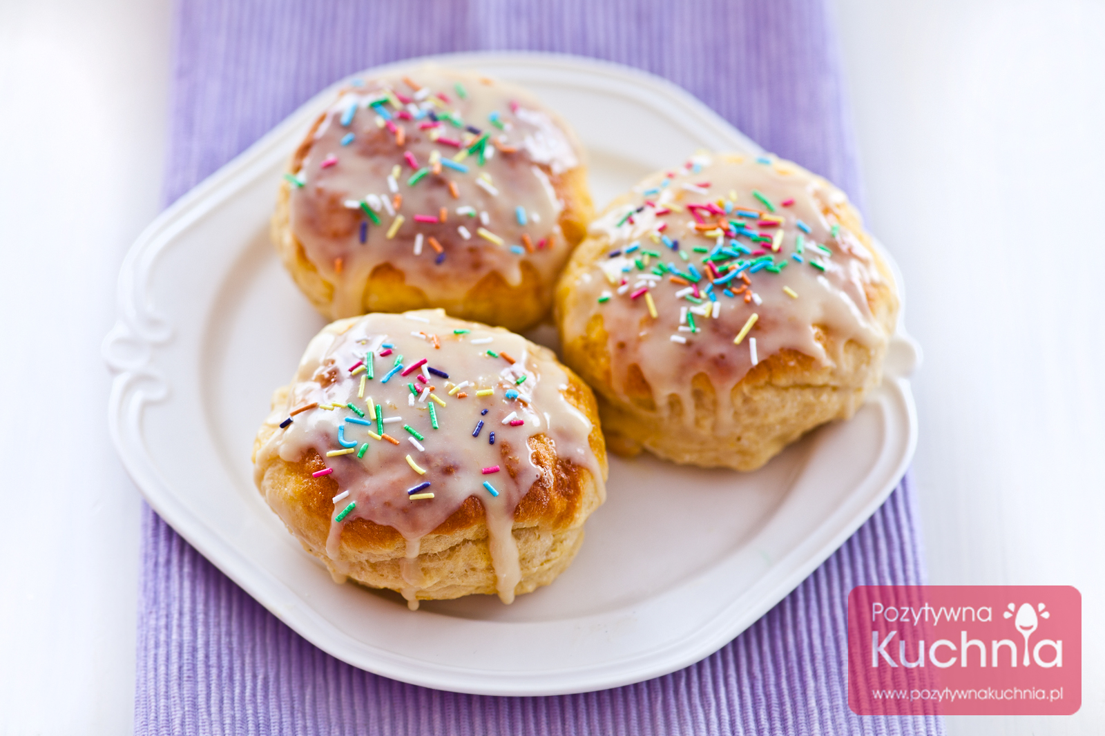Pączki pieczone warto udekorować. Klasyczny lukier tym razem zastąpię polewą z białej czekolady, nieco rzadszą, z podwójną ilością śmietanki. Ciekawa jestem jak będą wyglądały Wasze! Moje tym razem posypię kolorową posypką, a na upust fantazji w dekoracjach przyjdzie czas przy okazji smażenia amerykańskich donuts.