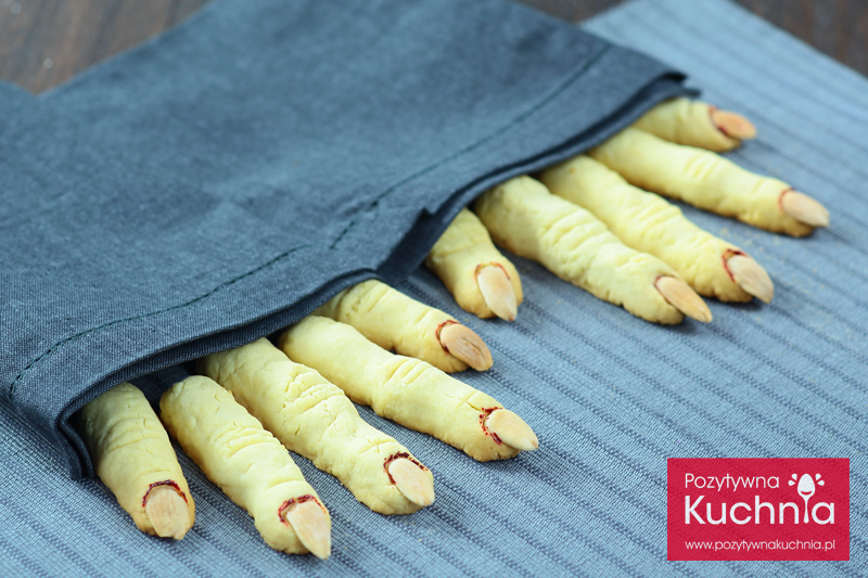 Palce wiedźmy, po upieczeniu, można dodatkowo delikatnie podmalować czerwonym barwnikiem spożywczym imitującym krew. Jeśli obchodzicie razem z dziećmi Halloween, takie kruche ciasteczka świetnie nadadzą się na tę okazję. Zamiast czerwonego barwnika można wykorzystać odrobinę dżemu lub konfitury, albo zmiksowanych malin. Im bardziej poplamione palce wiedźmy, tym lepszy, choć okropnie straszny efekt. Gwarantuję, że znajdą się tacy, co tych ciastek nie zjedzą, ale to z reguły dorośli, bo dzieciaki mają z nich po prostu niezły ubaw.