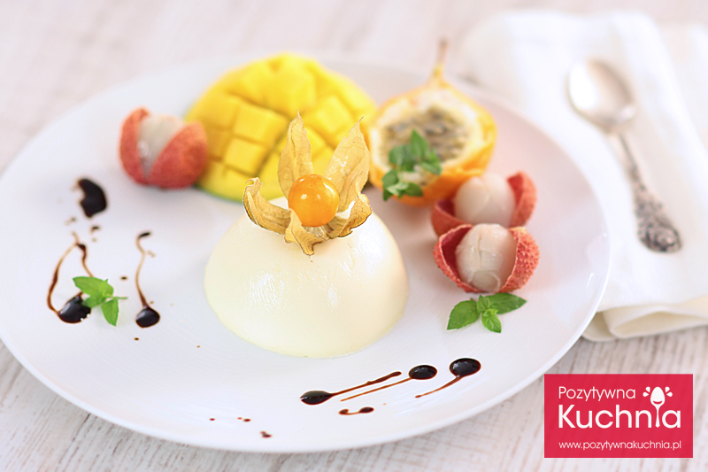 - Panna cottę układam na talerzykach i dekoruję owocami (do dekoracji będą pasować owoce jagodowe: truskawki, jagody, maliny lub egzotyczne: physalis, mango, liczi), frużeliną lub sosem owocowym albo polewą czekoladową i podaję.