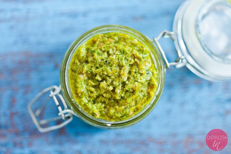 W sklepach można kupić całe mnóstwo składników, z których warto zrobić pyszne pesto, począwszy od bazylii, poprzez rukolę, pietruszkę, szpinak, paprykę i cukinię… Wypróbowałam wszystkie i bardzo lubię mieć w lodówce cały słoik pesto własnej produkcji, które wykorzystuję na wiele sposobów. Standardowy skład to zawsze główne, wiodące warzywo, do tego prażone orzechy lub nasiona, dobry olej i włoski ser. Dziś pesto z jarmużu, hit tego sezonu, bo w końcu można kupić te smaczne, zielone liście nie tylko na targowiskach, ale także w marketach i dyskontach: pakowany w foliowe torebki, czasami nawet nie wymaga mycia. Wystarczy kilka garści do wyczarowania różnych, zdrowych i zielonych przysmaków.
