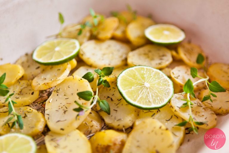 Pieczone ziemniaki są ekstra! Choć najprościej podać ugotowane, pieczone ziemniaczki z piekarnika, również zrobią się praktycznie same. Najwięcej czasu potrzeba do ich upieczenia. Samo przygotowanie to tylko obranie ich ze skórki, pokrojenie na plasterki i przyprawienie solą oraz, opcjonalnie, odrobiną białego pieprzu. Potem jeszcze trzeba koniecznie posmarować oliwą. Jednak moja ulubiona ich wersja to te z dodatkiem pięknie pachnących ziół i soku z limonki lub cytryny. Te dodatki najlepiej podkreślają ziemniaczany smak. Zobaczcie jak zrobić krok po kroku!