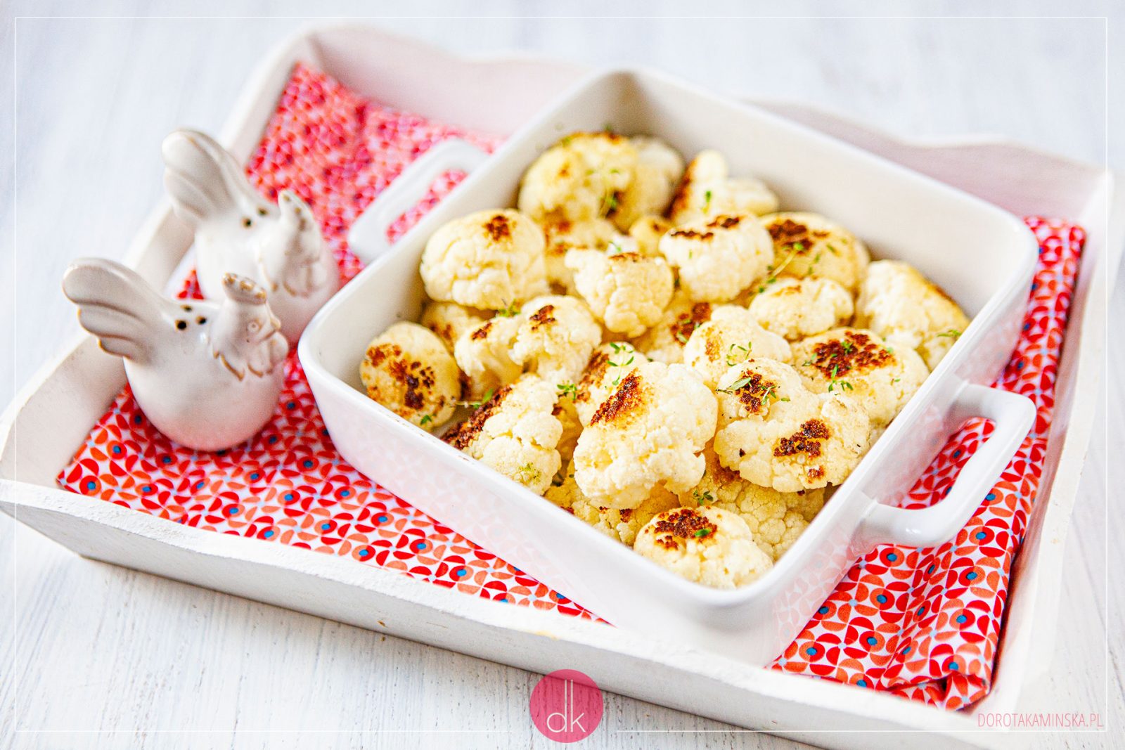 Pieczony kalafior to jeden z łatwiejszych do zrobienia dodatków do drugiego dania. Pyszny, pachnący ziołami lub korzennymi przyprawami, choć przyznam, że u mnie znajdziecie połączenie jednego i drugiego. Pokażę Wam dziś jak zrobić kalafior pieczony w piekarniku, choć możecie go też przygotować, smażąc na patelni do zrumienienia, a następnie dusząc pod przykryciem. Nie musi być bardzo miękki, bo zdrowszy jest ten „al dente”, czyli lekko twardy. Coś dla tych z Was, którzy nie przepadają za smakiem surowego kalafiora. Podzielony na mniejsze różyczki lub w całości – jak kto woli.